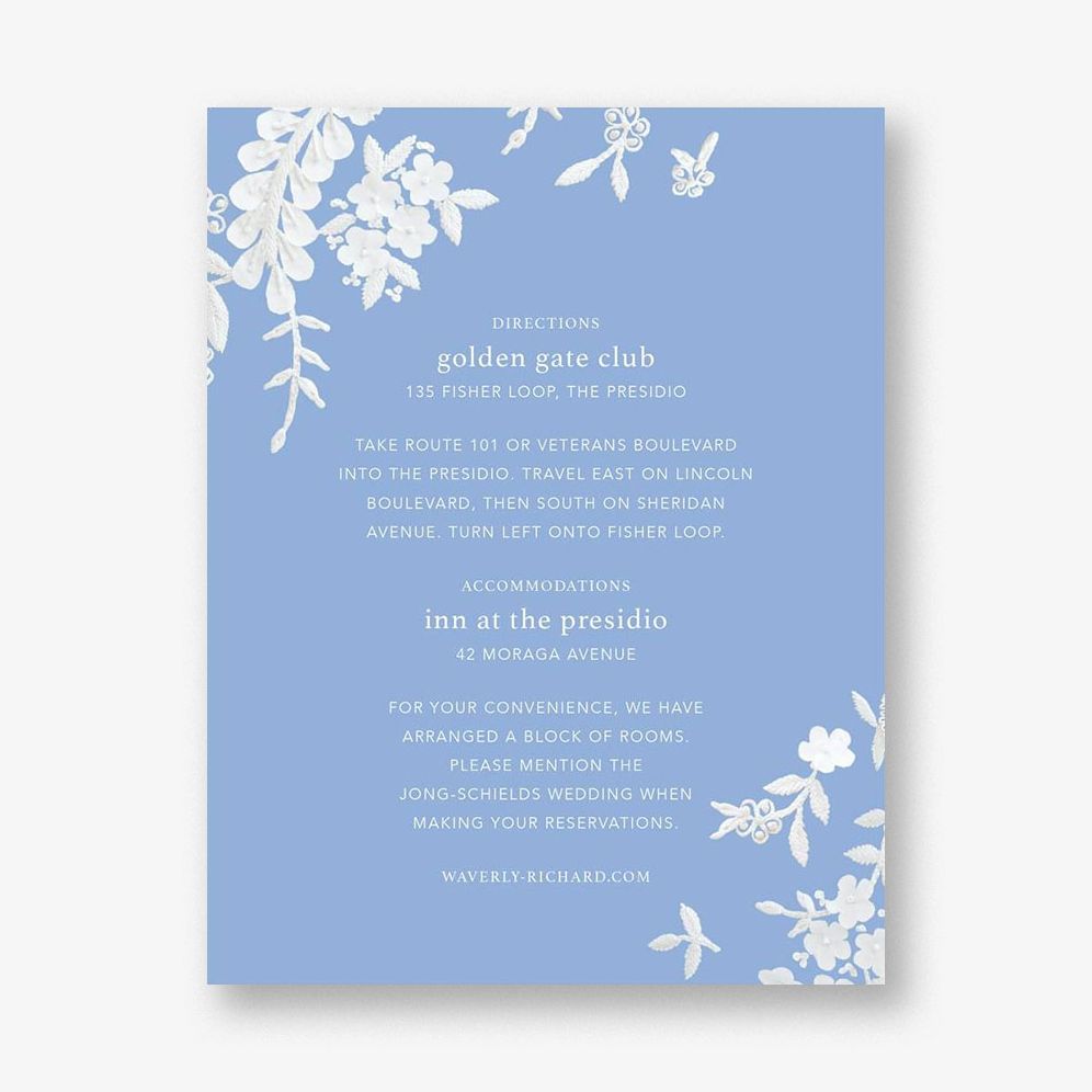 Your wedding details stand out elegantly in tranquil shades of clear white and cornflower blue on the Fleurs d’Alençon Information Card. designed by Oscar de la Renta for Paperless Post.