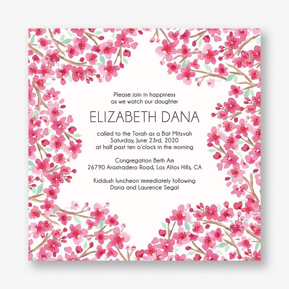 A modern and elegant way to invite guests to your young woman’s special day. Design features a pink blossom design that creates a lovely Star of David silhouette. Event details are beautifully framed in the middle.