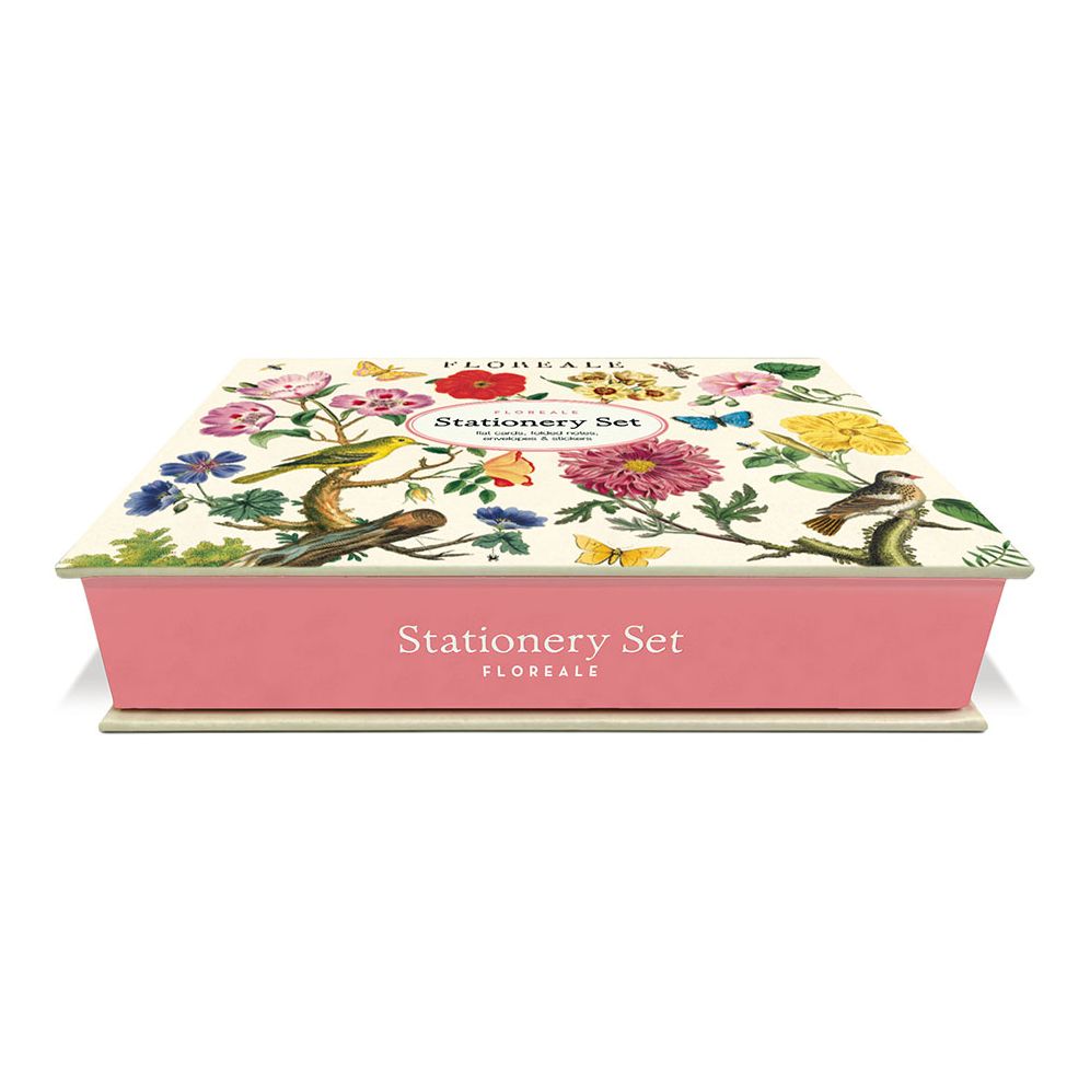 Stationery Set includes 8 flat cards with envelopes. 8 folded notes with envelopes. and 4 sheets of stickers printed on our signature archival label stock. Featuring vintage images from the Cavallini archives. this writing set is perfect for everyday correspondence.
