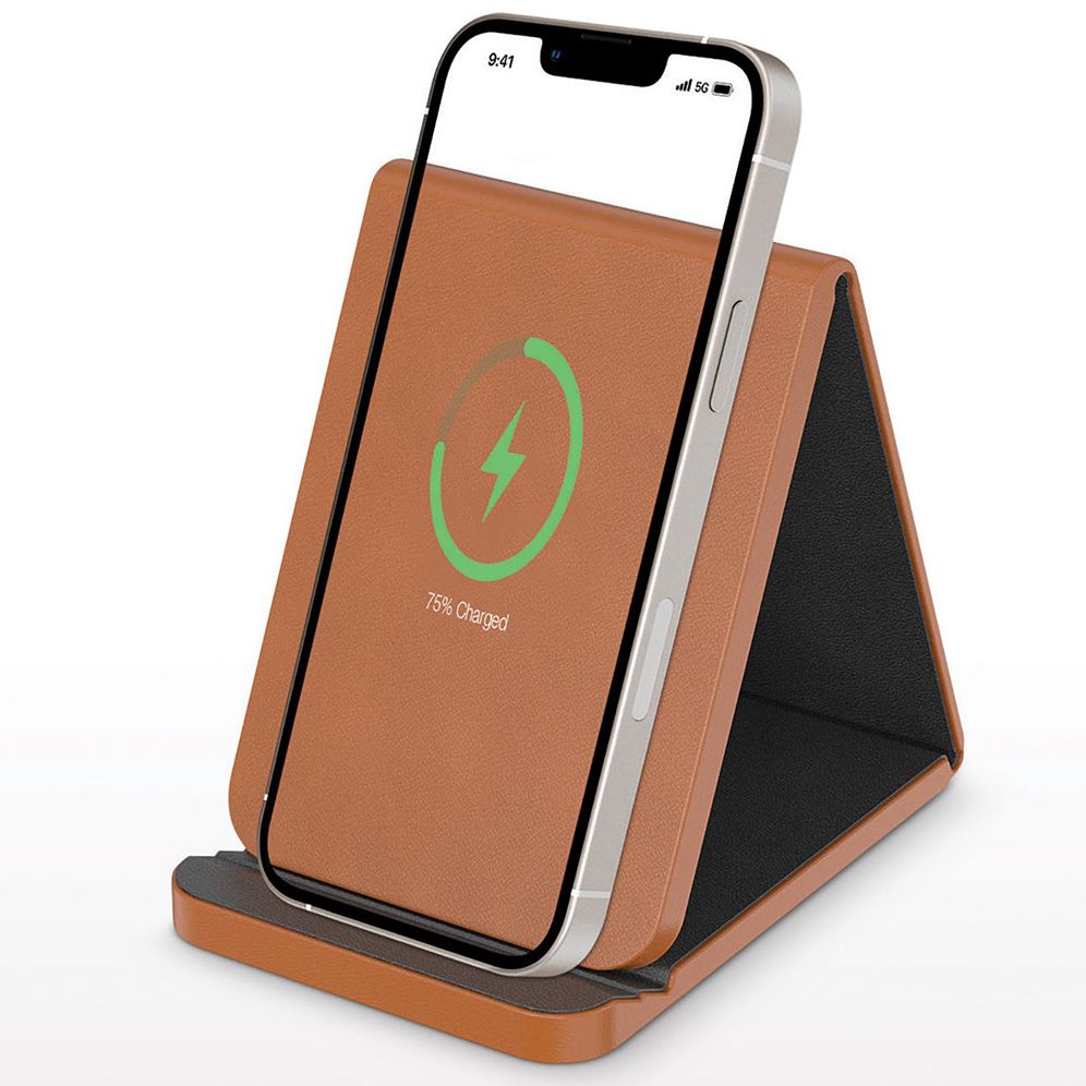 This unique Folding Leather Wireless Charging Stand elegantly combines the natural beauty of leather with wireless technology. When you need a charge. simply place any wirelessly compatible digital device on the charging portion of the pad. Can be used flat or folded as a handy phone stand while charging your device. Great as a versatile. multi-purpose stand when not using the phone charger feature: prop up a device to make video calls. view messages while working. read recipes while cooking. even watch favorite shows – all hands free. Compact and lightweight. it’s perfect for packing along when traveling. The Leather Wireless Charging Stand is a great looking addition to your desk. counter. or nightstand. Wireless output: Fast Charge up to 10W (5W/7.5W/10W) Charges through most standard cases. Compatible with recent models of Apple (iPhone 8 or later). Samsung. and other wireless compatible phones devices.
