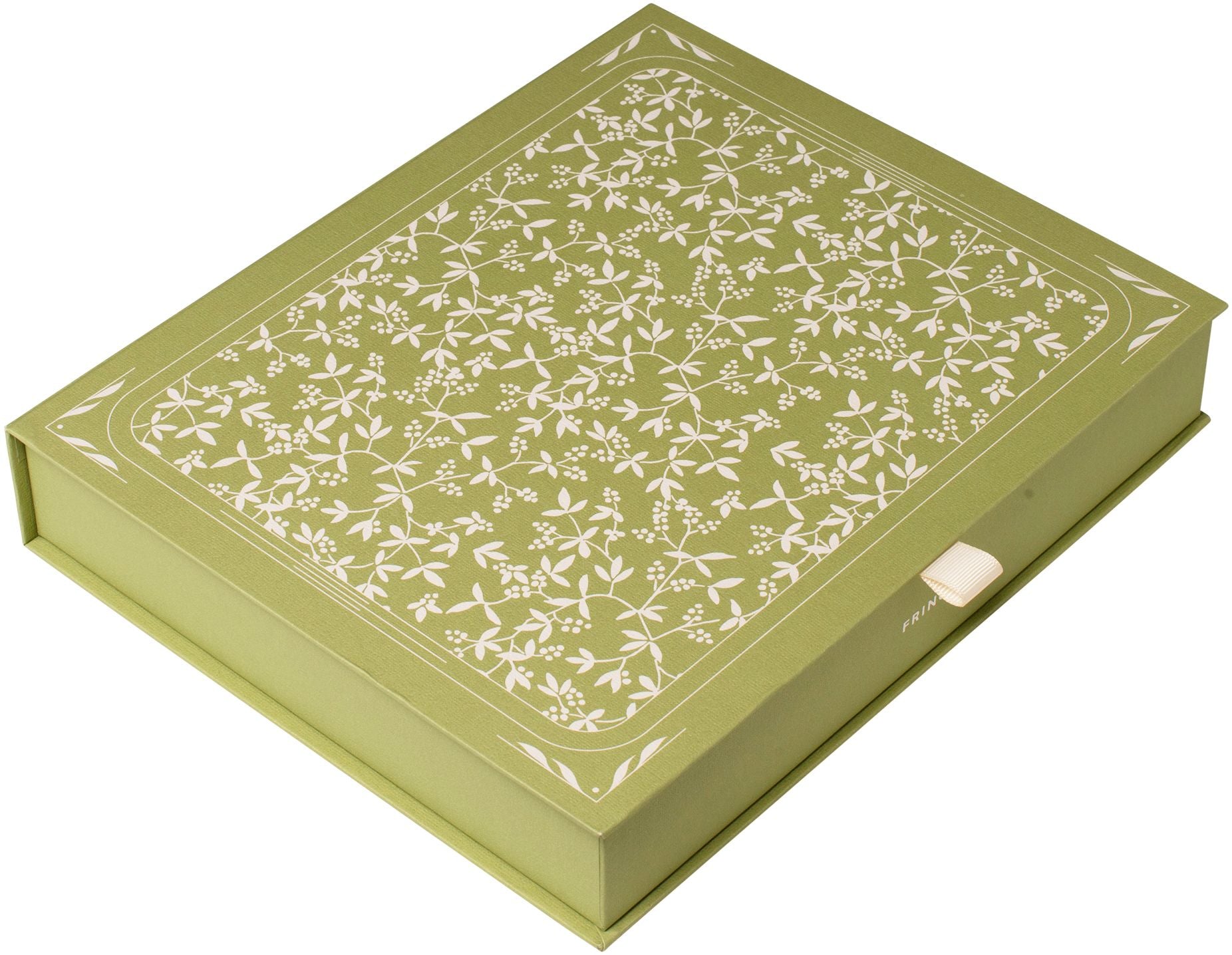 Stationery writing set with 20 letter sheets featuring metallic gold foil design accents and coordinating envelopes. 12 blank notecards with coordinating envelopes. and 24 stickers. It is packaged in a keepsake decorative gift box with ribbon pull tab and hidden magnetic closure. Write thoughtful notes and letters to loved ones. then reuse the box as storage for personal mementos!