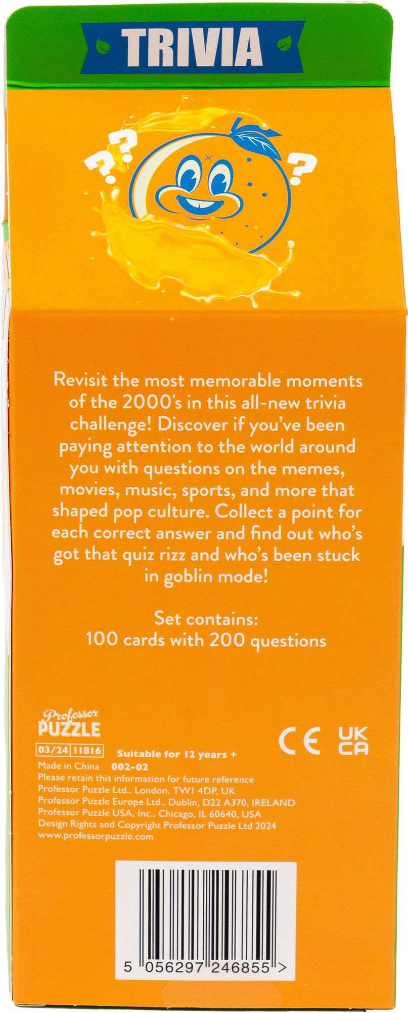 The Freshly Squeezed Trivia Game Set stands out with its unique packaging. designed to resemble a carton of orange juice. complete with a splashy. cheerful orange character that’s sure to brighten up your shelf and become a conversation starter. The compact size makes it easy to store or take with you to parties. family gatherings. or any social event where you want to add a dash of fun.