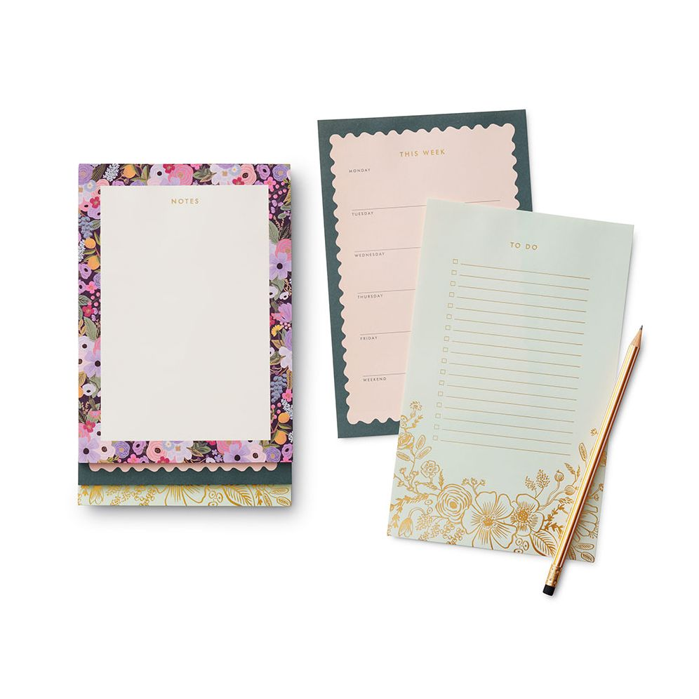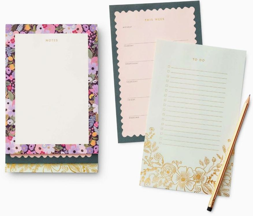 This tiered notepad is a triple threat. With three 25-page sections. it contains space for writing notes. creating lists. and planning your week. with illustrated designs and gold foil on every page.