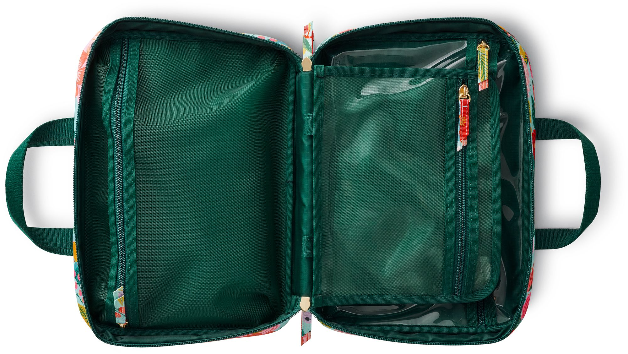 A cosmetic case by Rifle Paper Co. with a lay-flat design. zip-around closure. pockets for storage. and a removable clear pouch. Sturdy. easy to clean nylon material makes it ideal for travel.