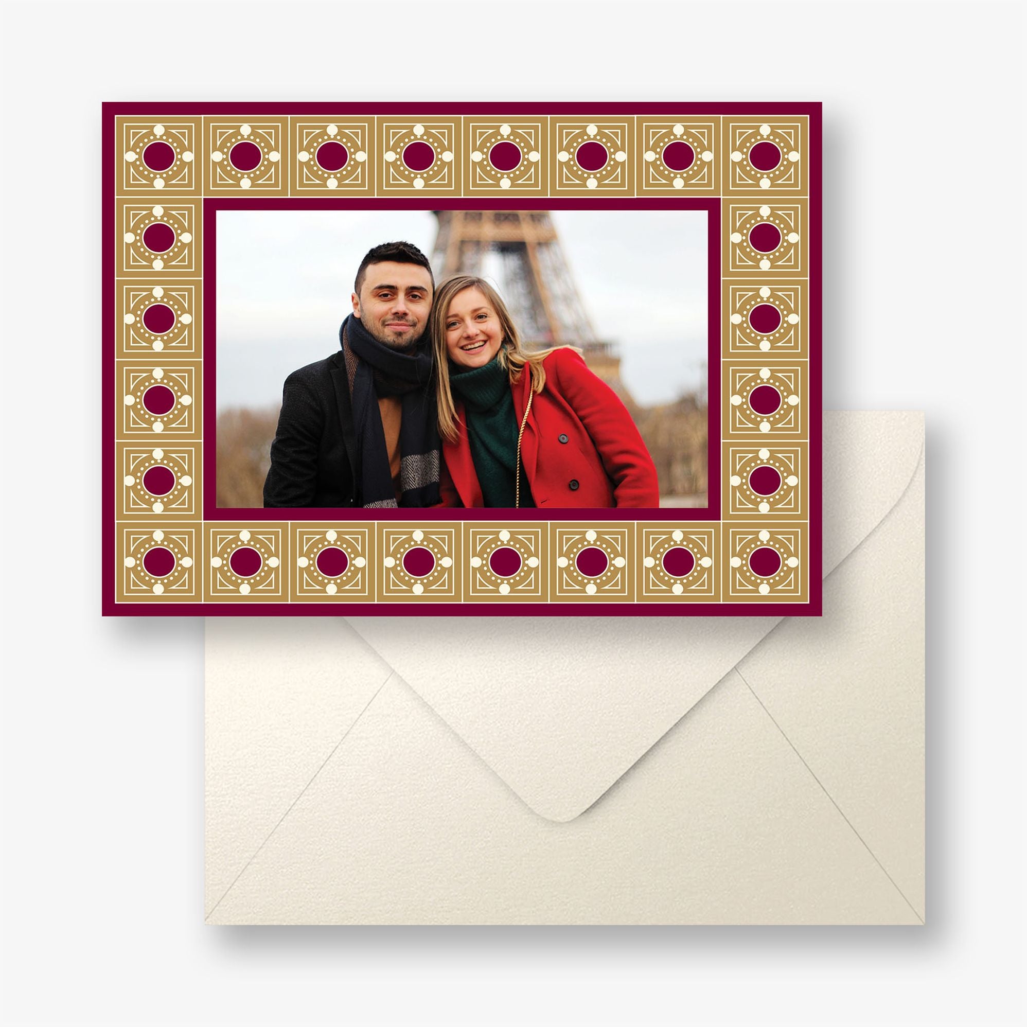 Inspired by Neil Lane’s Victorian garnet and pearl bangle bracelet. this holiday photo card features a rich garnet-hued tile border. accented with delicate. pearl-like detailing that echoes the beauty of vintage heirloom jewelry. The design frames your photo like a treasured keepsake and adds a touch of old-world glamour to your most cherished memories.