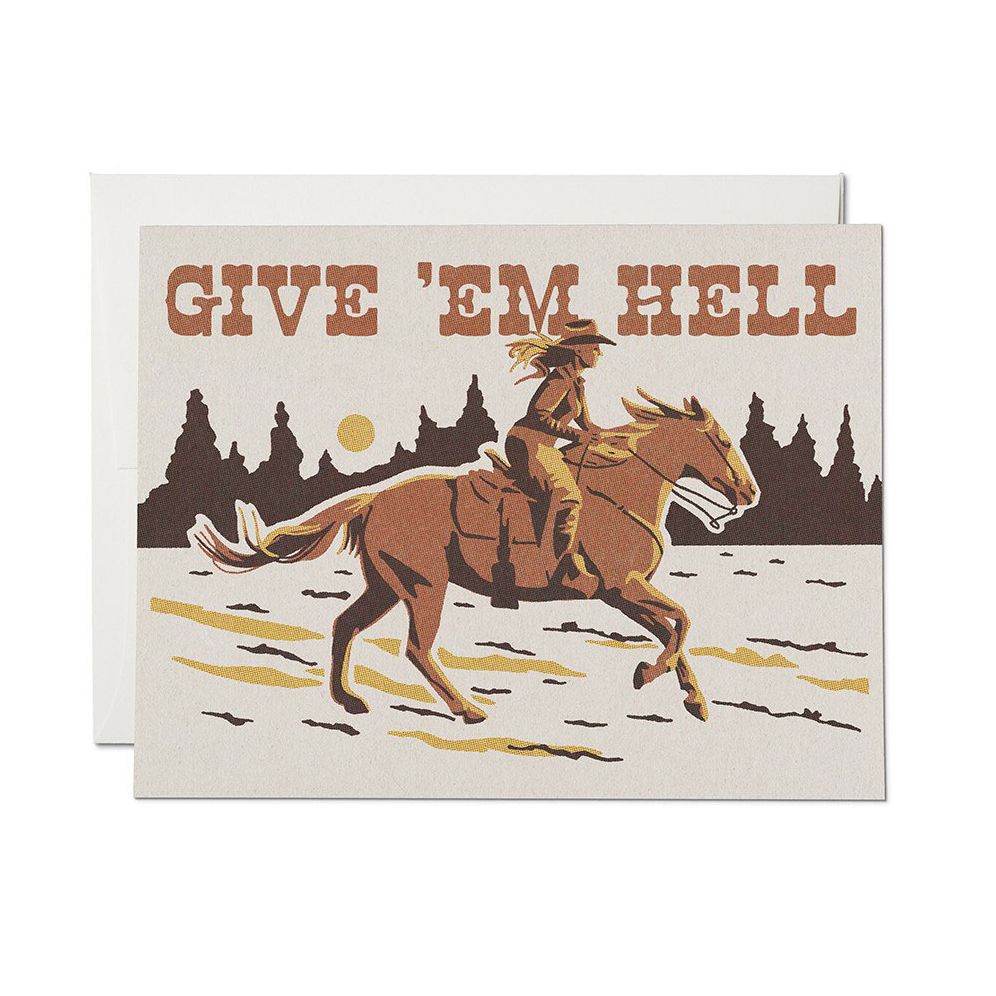 Designed and printed in the US. Heavyweight card stock. soy based inks. 30% post-consumer recycled paper. FSC & SFI certified. Off-set printing. Exterior Greeting: GIVE ‘EM HELL. Interior Greeting: Blank.