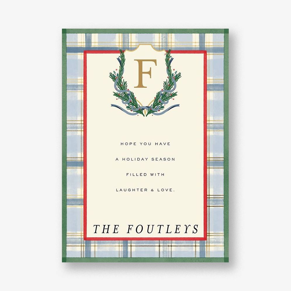 Wrap your holiday greetings in classic plaid. handpainted to add a touch of timeless charm. Printed on Mohawk 120.0 lb Superfine Ultra White. This paper is FSC certified. with 30% post consumer recycled content. and made using wind power.