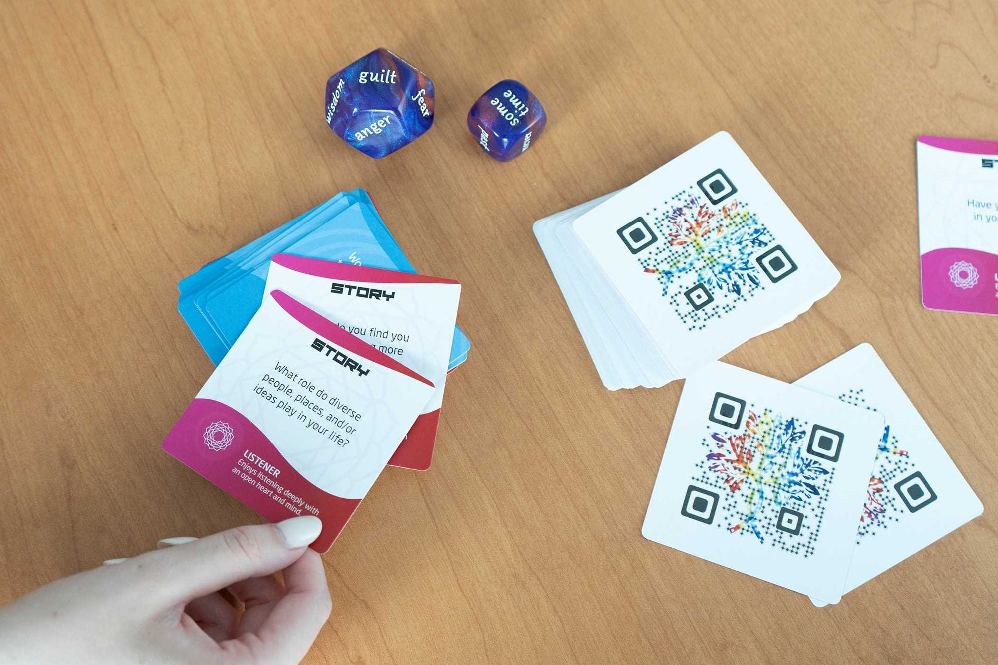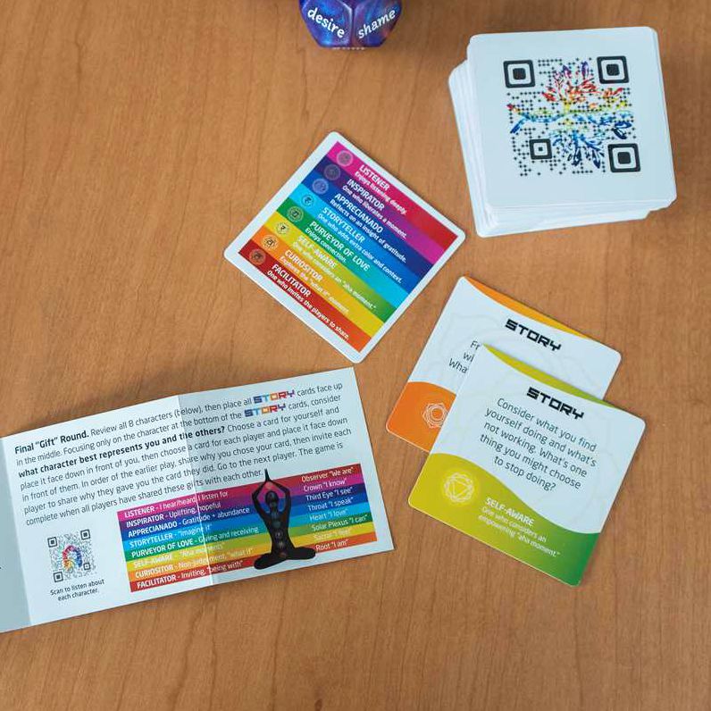 Players roll the Time and Space dice. draw a Story Card with questions and prompts. and share. Anyone at the table can use their personal Gratitude or Curiosity Cards to thank the speaker or deepen the conversation with questions and insights. QR codes lead players to additional content online from Deepak Chopra.