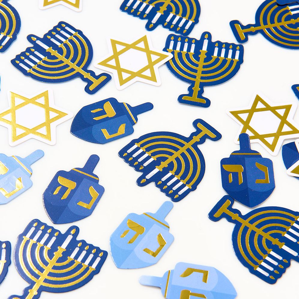 Add some festive flare to your table with our Hanukkah table scatter. featuring festive icons! Perfect to use as party decorations or for crafting.