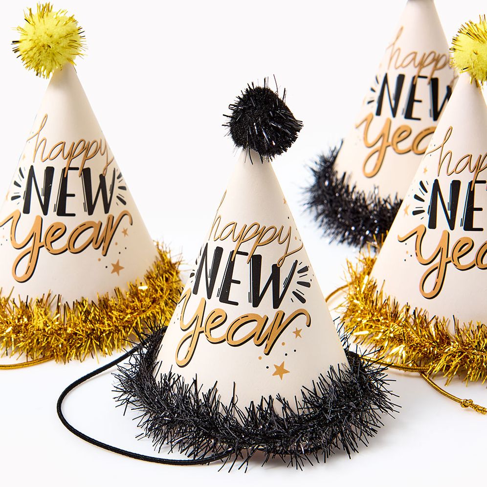These adorable mini party hats are perfect for celebrating the new year! They have little glitter details and say Happy New Year.