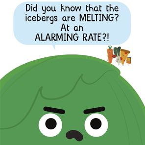 Harold is an iceberg… lettuce. (But he doesn’t realize the lettuce part because part of his sticker has ripped off.) So one day when he sees a documentary about how the icebergs are melting. Harold starts to worry. thinking that he’s melting too.