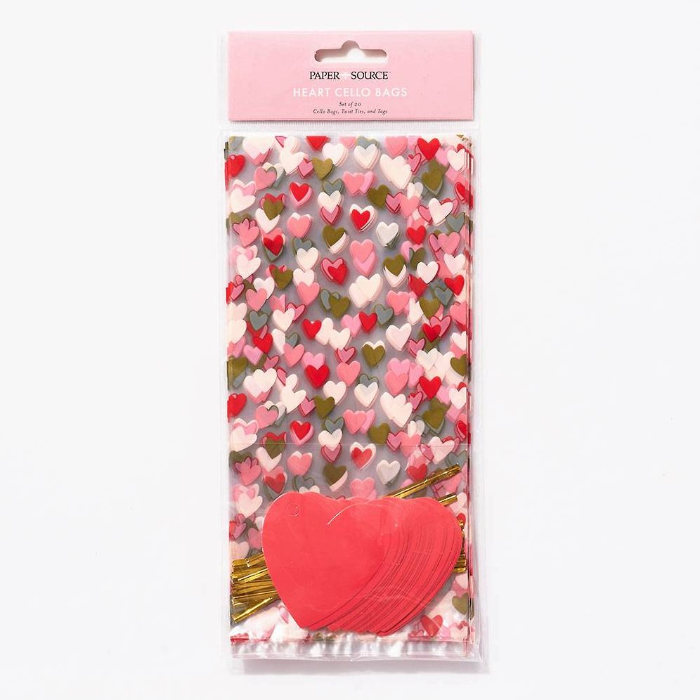 Fill these festive food-safe cellophane bags printed with foil hearts with fun goodies and treats for family and friends. Each bag comes with a gold twist tie and heart tags to complete the package. Paper Source exclusive.