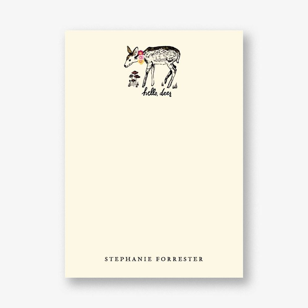 A hand-drawn deer sits at the top of this stationery with the words. Hello Deer underneath. An adorable way to say hello to friends or family. Printed on superfine soft white 130 lb. card stock that has a smooth finish and is soft to the touch. Paper is FSC certified and made using wind power.