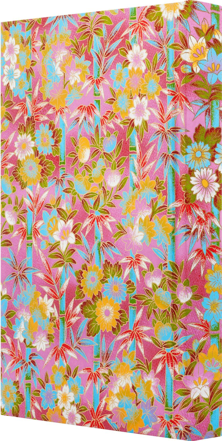 Enjoy this A5 Heritage notebook for uninterrupted creative thinking. Explore your in-depth thoughts. and ideas on the 88 premium-grade blank leaves. sourced from a UK paper mill. suitable for many drawing & writing instruments. Hand-bound in our bindery in the South of England in a beautiful silk screen printed paper selected from an archive of designs in Kyoto Japan. This notebook features a graphic tropical design featuring towering clusters of golden yellow. white and blue coloured flowers interspersed with bamboo against a stunning purple background. This paper features a gold accent screen. that gives it a truly opulent finish.