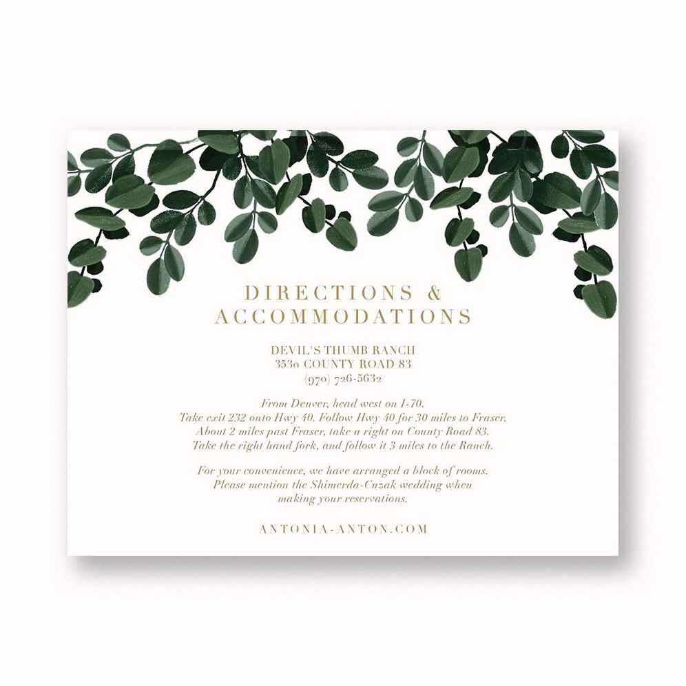 The Herrgarde Information card. part of the Herrgarde suite of wedding cards. features lovely hanging vines. Designed by Paperless Post. Printed on Mohawk superfine white 130 lb. card stock that is soft to the touch and matches our superfine white envelopes. Paper is FSC certified and made using wind power.