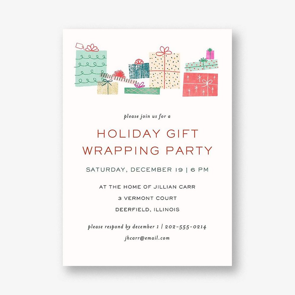 Get your guests in the mood for gifts with these festive holiday invitations featuring a tempting pile of expertly wrapped gifts above your party details. Designed by Paper Source.