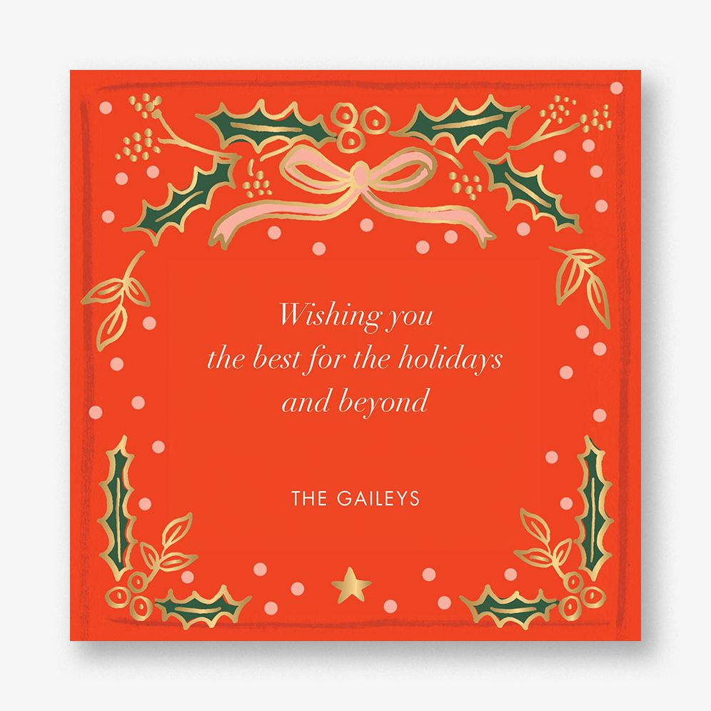 Luxe foil accents on a bright red background create holiday cheer on this design from Rifle Paper Co. for Paperless Post. Printed on Mohawk ultra white. 120 lb. card stock that is soft to the touch and matches our superfine white envelopes. Paper is FSC certified and made using wind power.