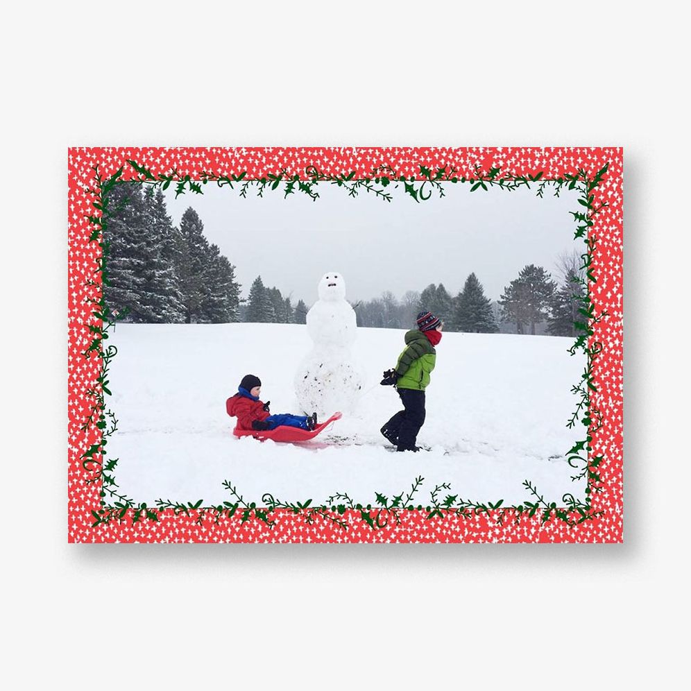 Personalize your holiday correspondance with a family photo on this horizontal holiday photo card by Mr. Boddington’s Studio for Paperless Post. This card features a festive mistletoe border enclosed with a snowy red border to get you and your loved ones in the holiday spirit.