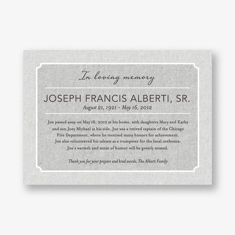 Welcome family and friends to remember a loved one with this classic bordered memorial invitation. featuring distinctive lettering on a linen background. Printed on white 130 lb cover paper with a tactile vellum finish. 100% post-consumer waste. FSC certified.