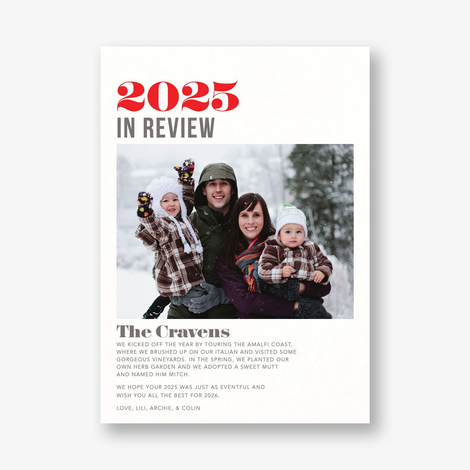 Send your loved ones a year-end review of what you’ve been up to with this photo card by Paperless Post.