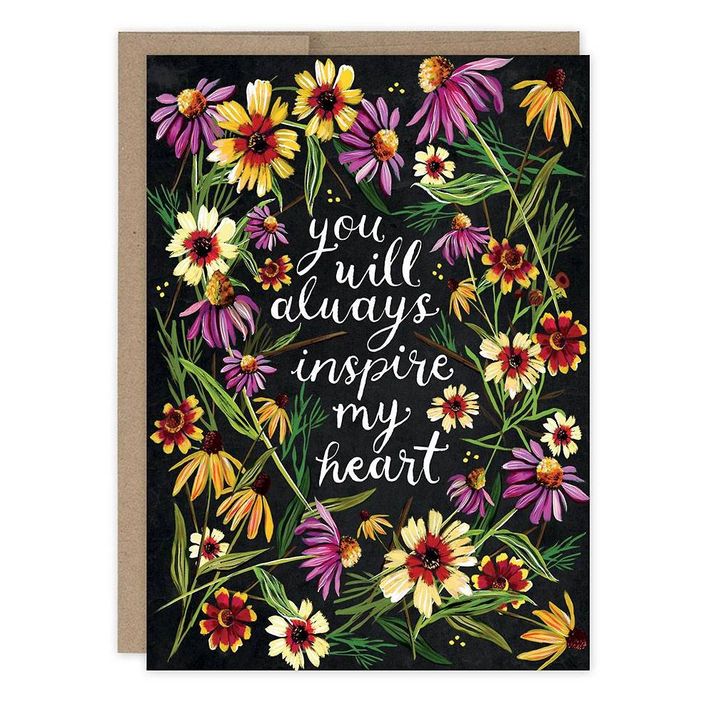 Share this card with the person you love. Outside caption. You will always inspire my heart. Inside caption. I love you wildly. Designed and printed in USA. Paired with matching envelope. From Katie Daisy. Biely & Shoaf.