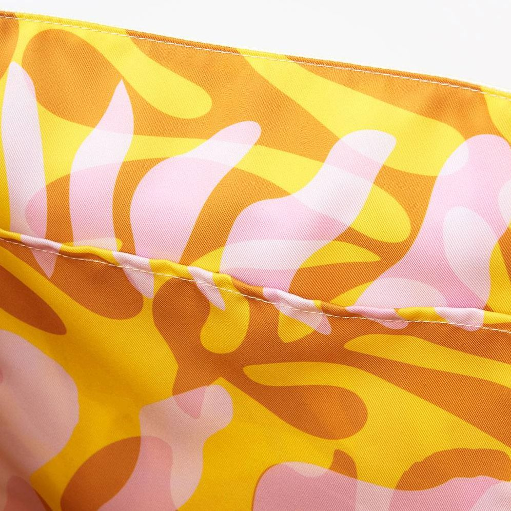Tote bag with a spot to also hold your beach hat. Tote is made of a jute material. measures 18.75 l and has an inner pocket.