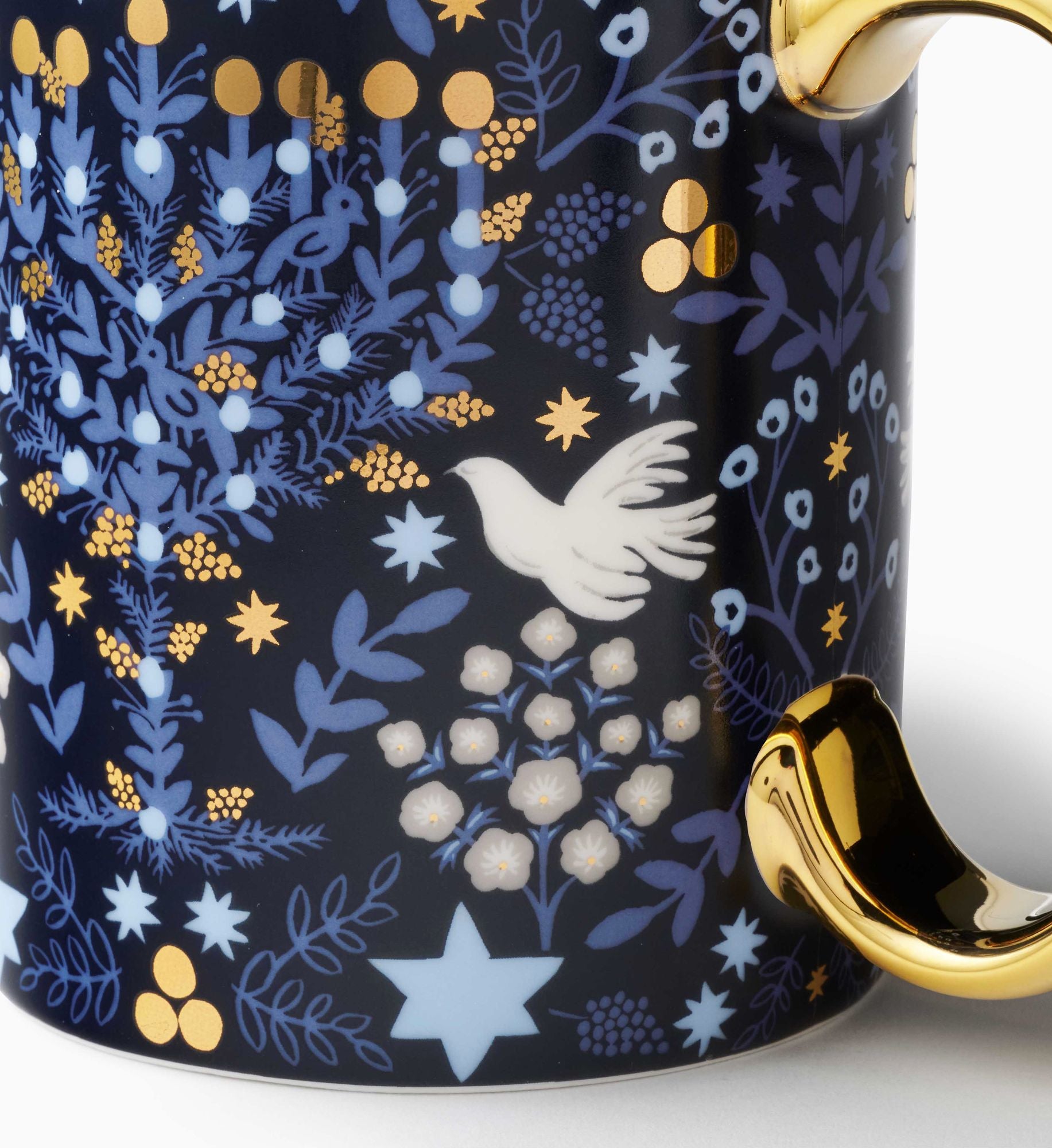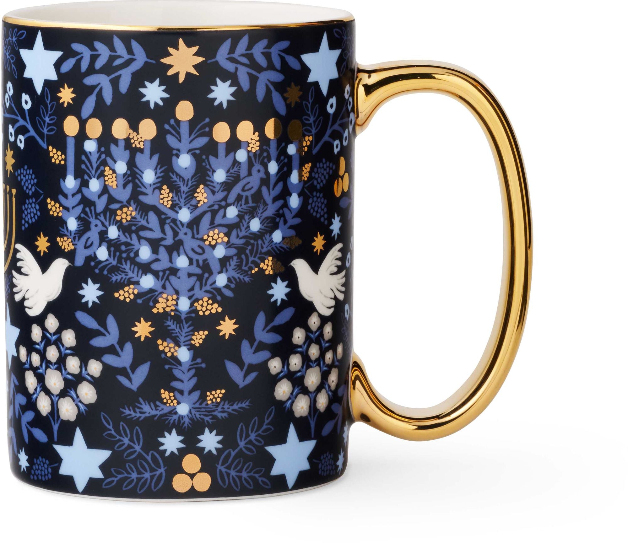 Illustrated doves. laurels. and glowing candles decorate this porcelain Hanukkah mug. accented by a polished gold handle and rim.