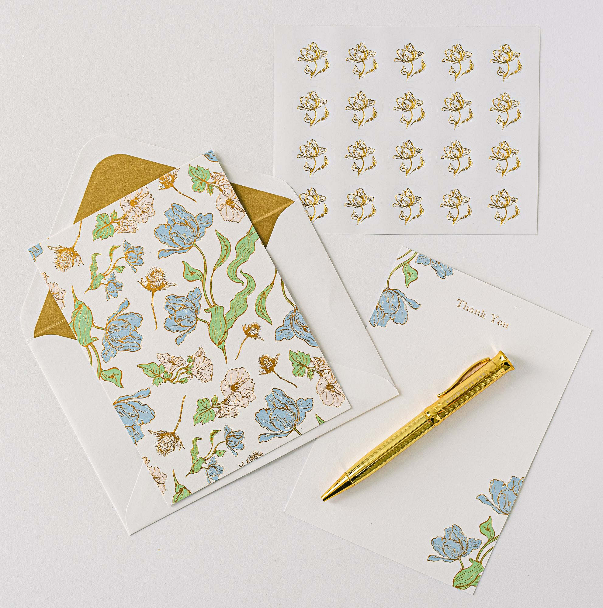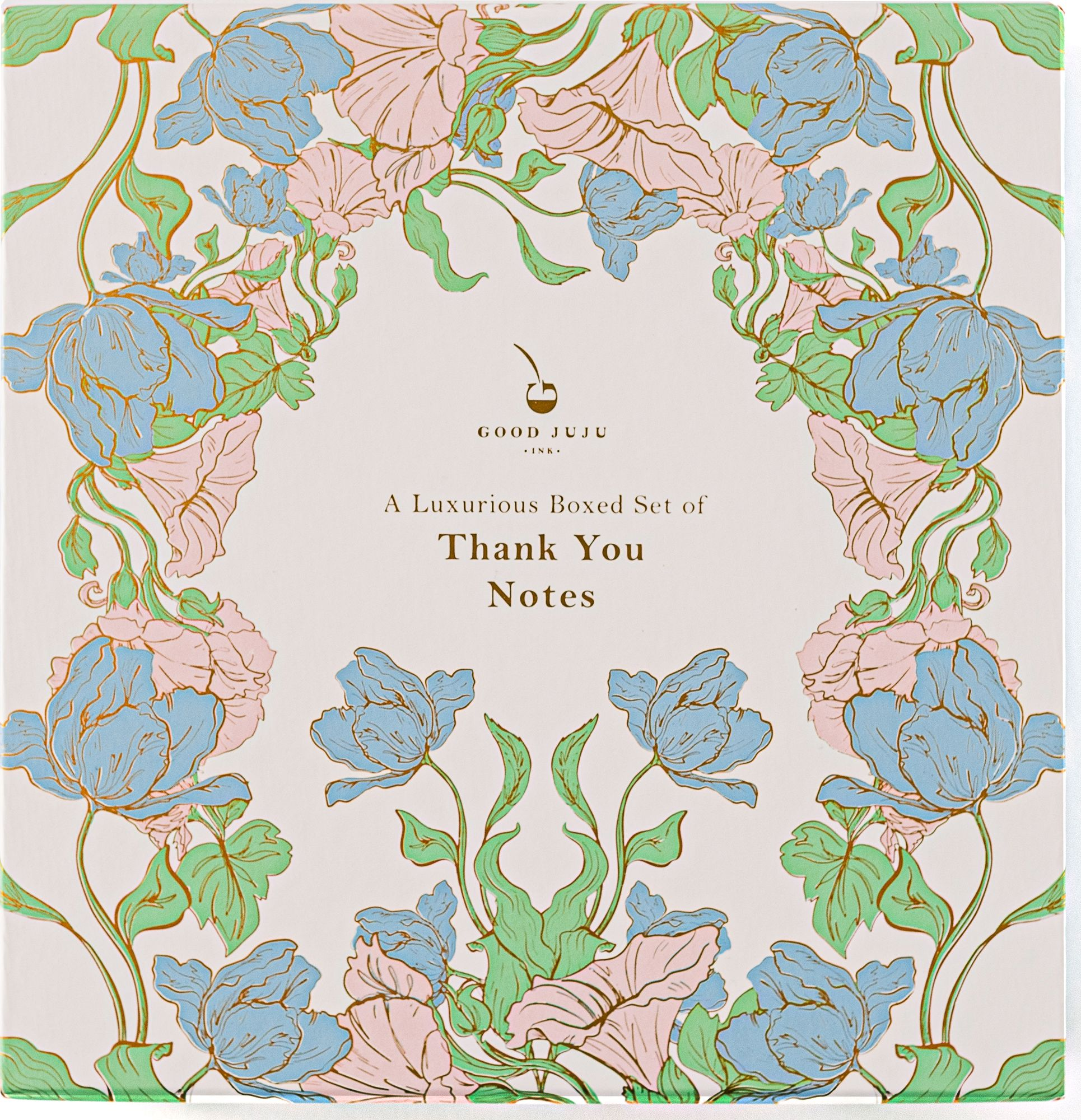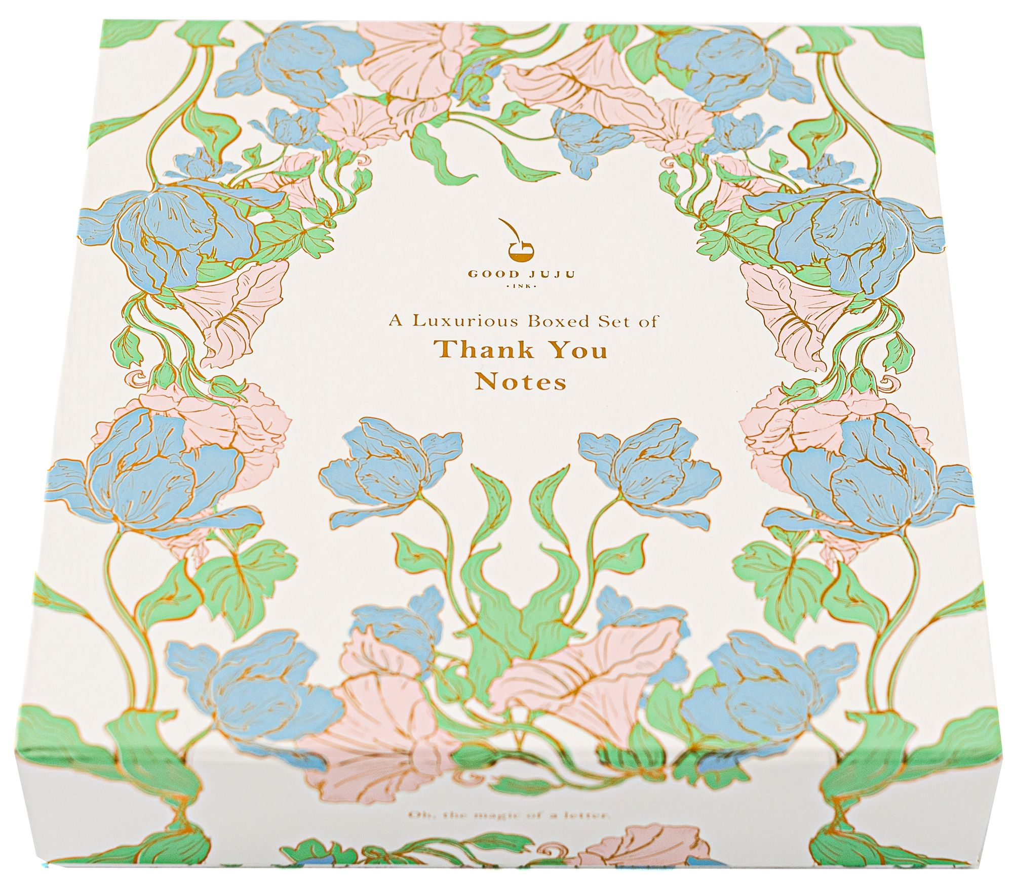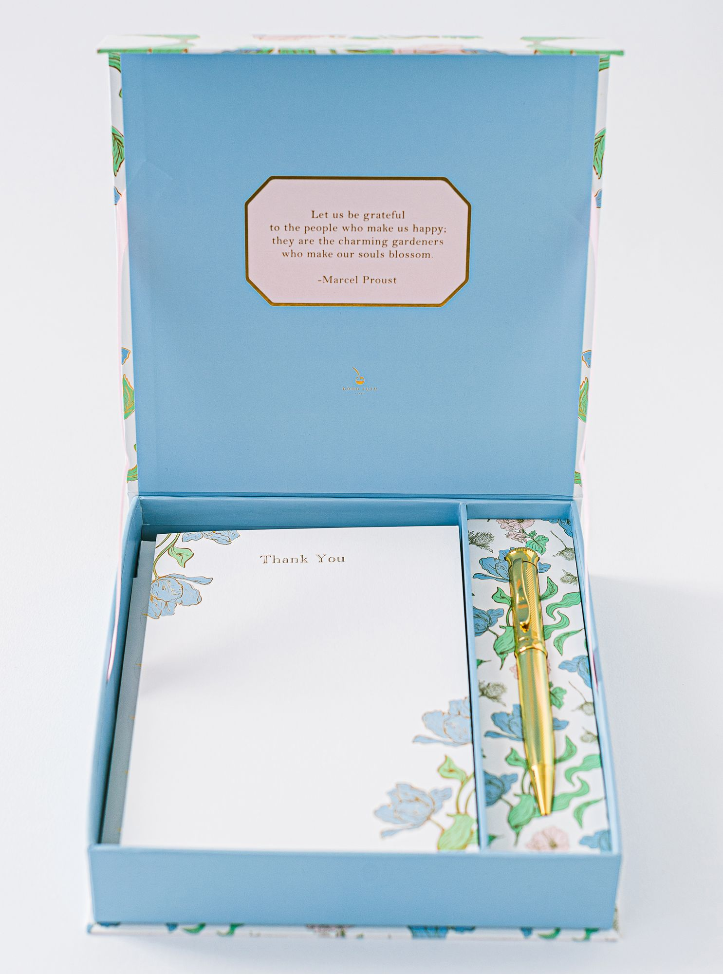 Looking for a luxurious way to say thank you? Use this gorgeously illustrated stationery set to share your gratitude. Each set comes in a stunning gold-foiled keepsake box with magnetic flap closure and includes: