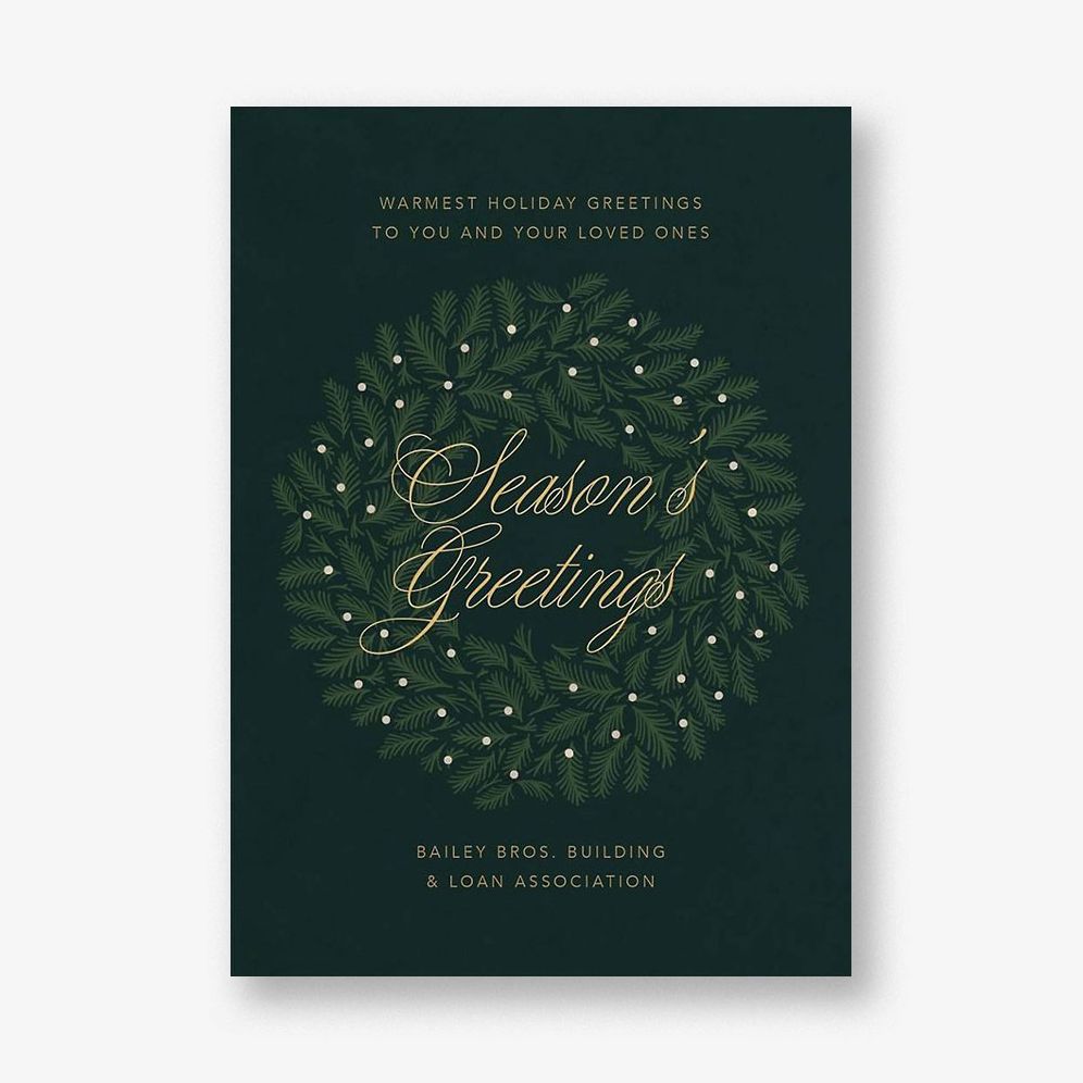 A classic wreath meets modern design on this elegant holiday card. Printed on Mohawk 120.0 lb Superfine Ultra White. This paper is FSC certified. with 30% post consumer recycled content. and made using wind power.