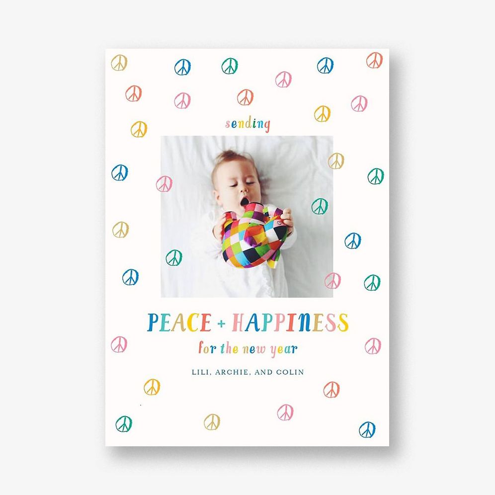 Multicolored peace signs pepper the face of this vibrant New Year photo card from the designers at Mr. Boddington’s Studio for Paperless Post.