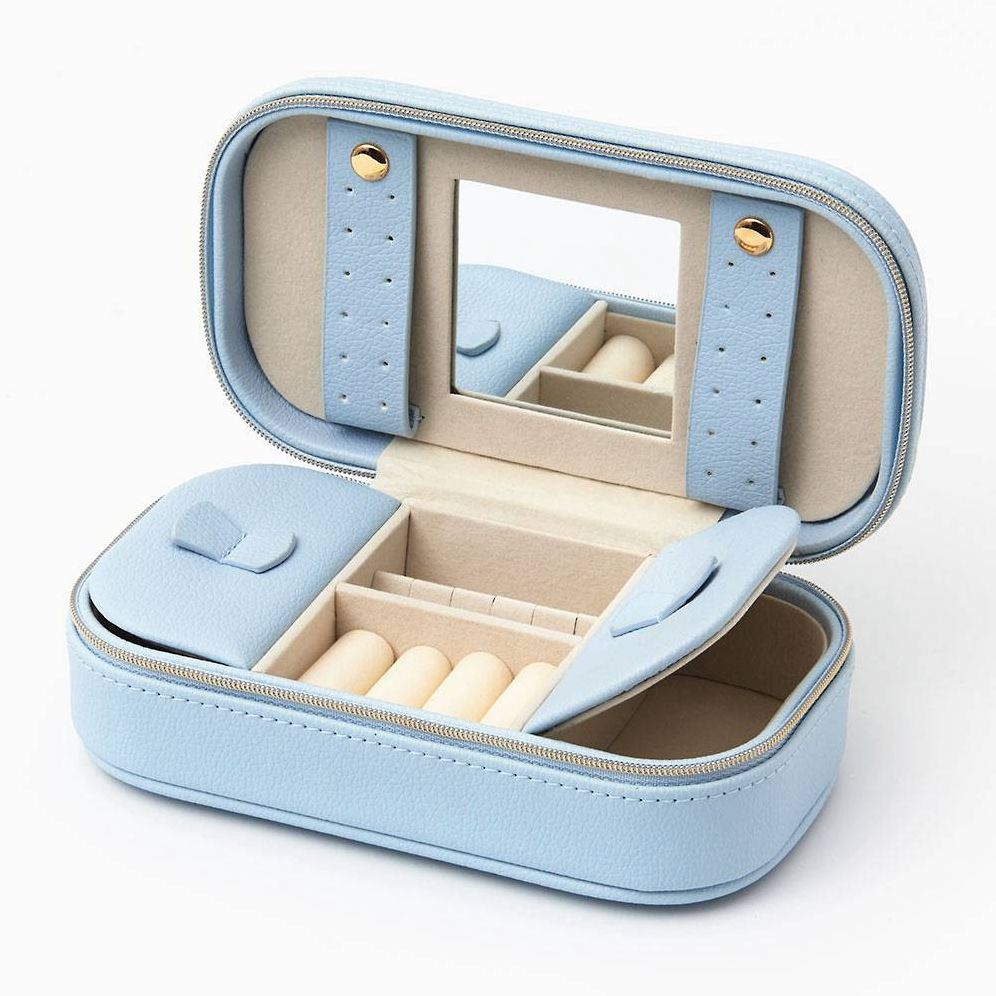 This light blue vegan leather travel zip around jewelry case is perfect for keeping your bits and bobs safe either while on the road or as an accent on a side table or dresser! Mirrored on the inside with spaces for all your rings. chains and special pieces.