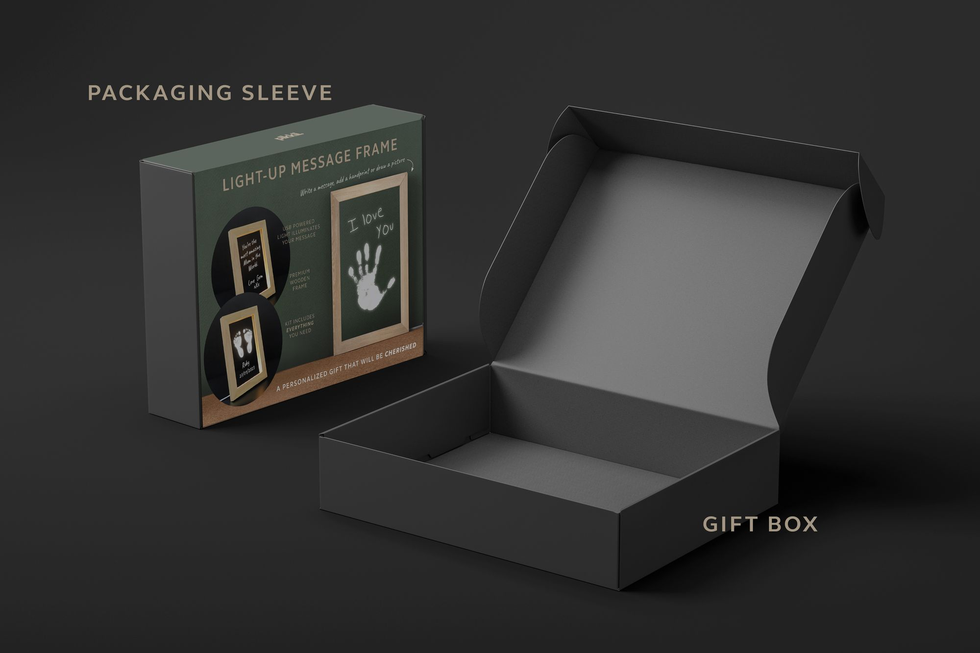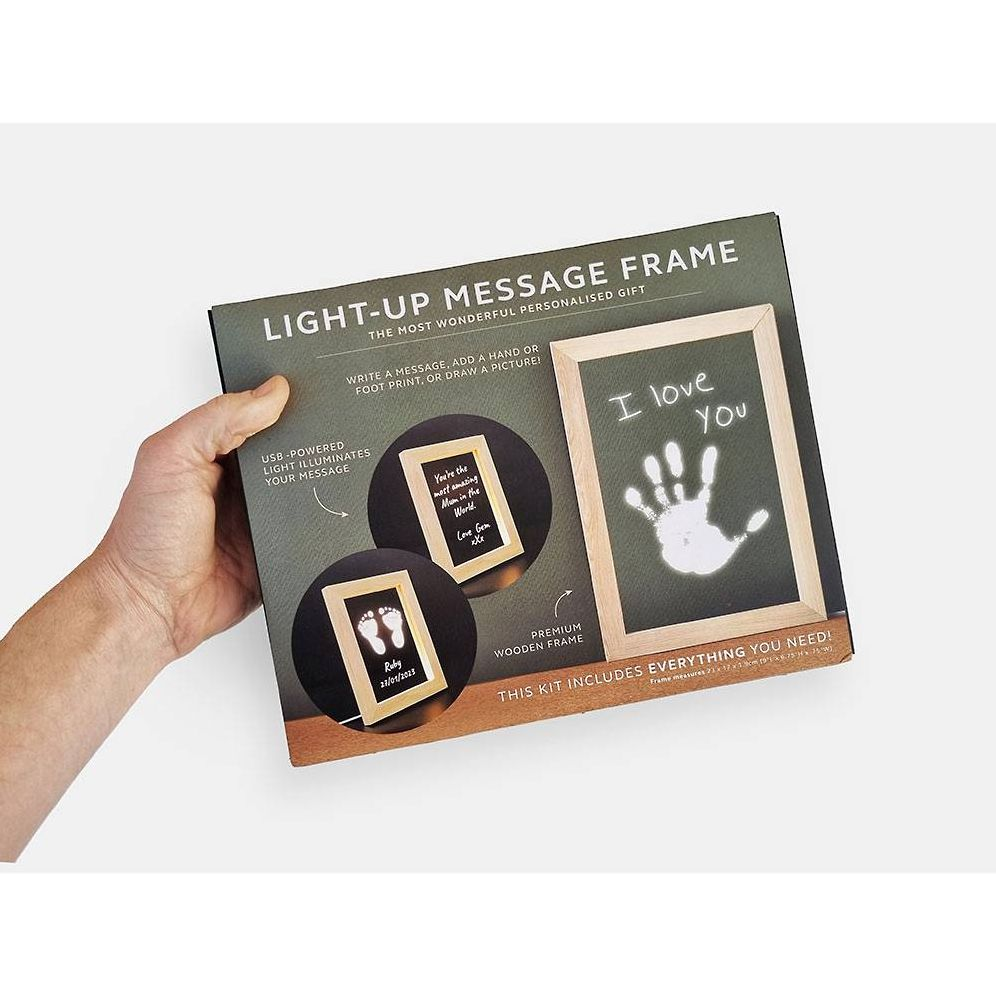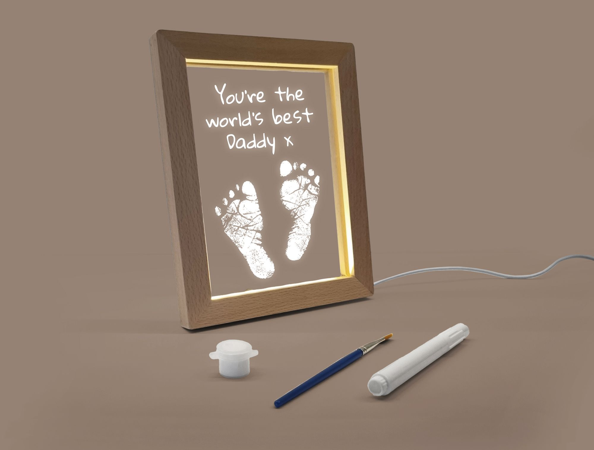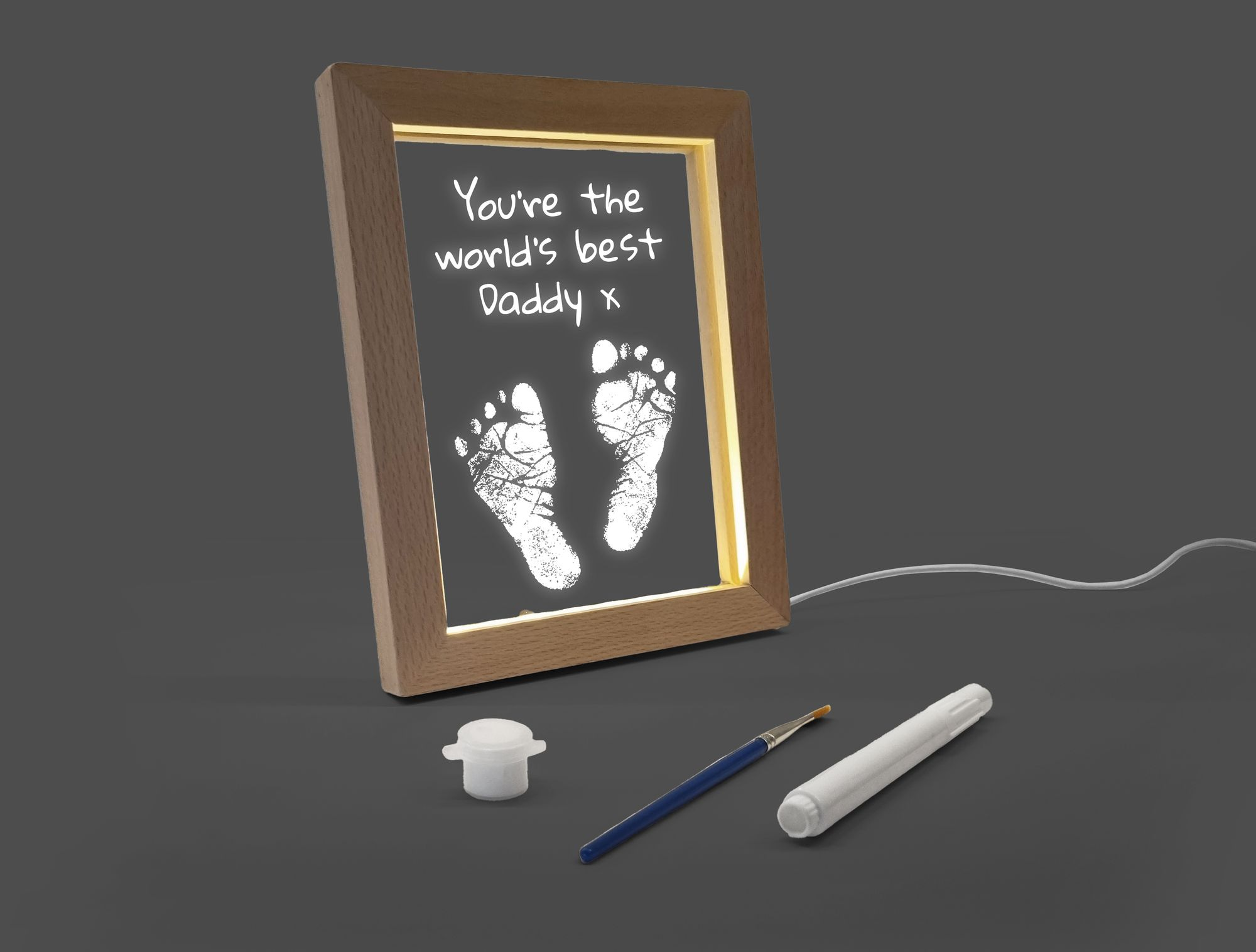 The LED frame comes with everything you need to create the perfect personalized gift. Use the paint to add a little hand or foot print. and use the pen to write a message or even draw a picture! When the USB frame is switched on. your personalized message glows making an incredible desk lamp that is guaranteed to make anyone smile.