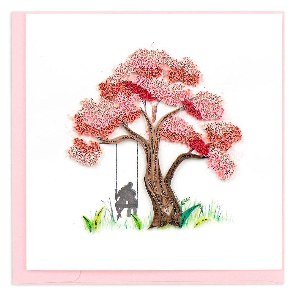 The perfect quilled card to send your lover for Valentine’s Day. an anniversary. or to celebrate any love that is blossoming! In this handcrafted design. the curved trunk of the tree is made up of various browns. with a variety of crimped pinks and reds making up the flowers blooming in the tree. There is a couple in silhouette sitting on a swing hanging from the tree and there is a heart carved into the trunk.