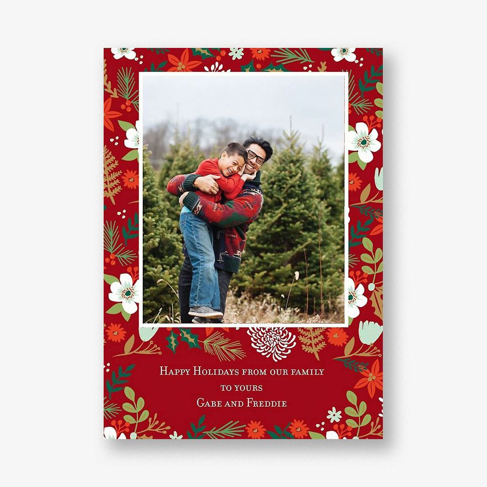 Let holiday tidings ring from home to home with this tasteful holiday photo card. Send a warm and loving message to friends and family with one of our unique custom holiday cards. featuring artwork created by our designers in Chicago. Printed on Mohawk ultra white 120 lb. card stock that is soft to the touch and matches our superfine white envelopes. Paper is FSC certified and made using wind power.