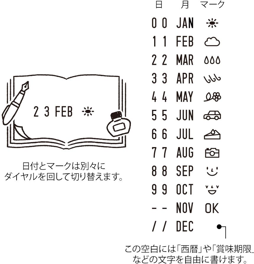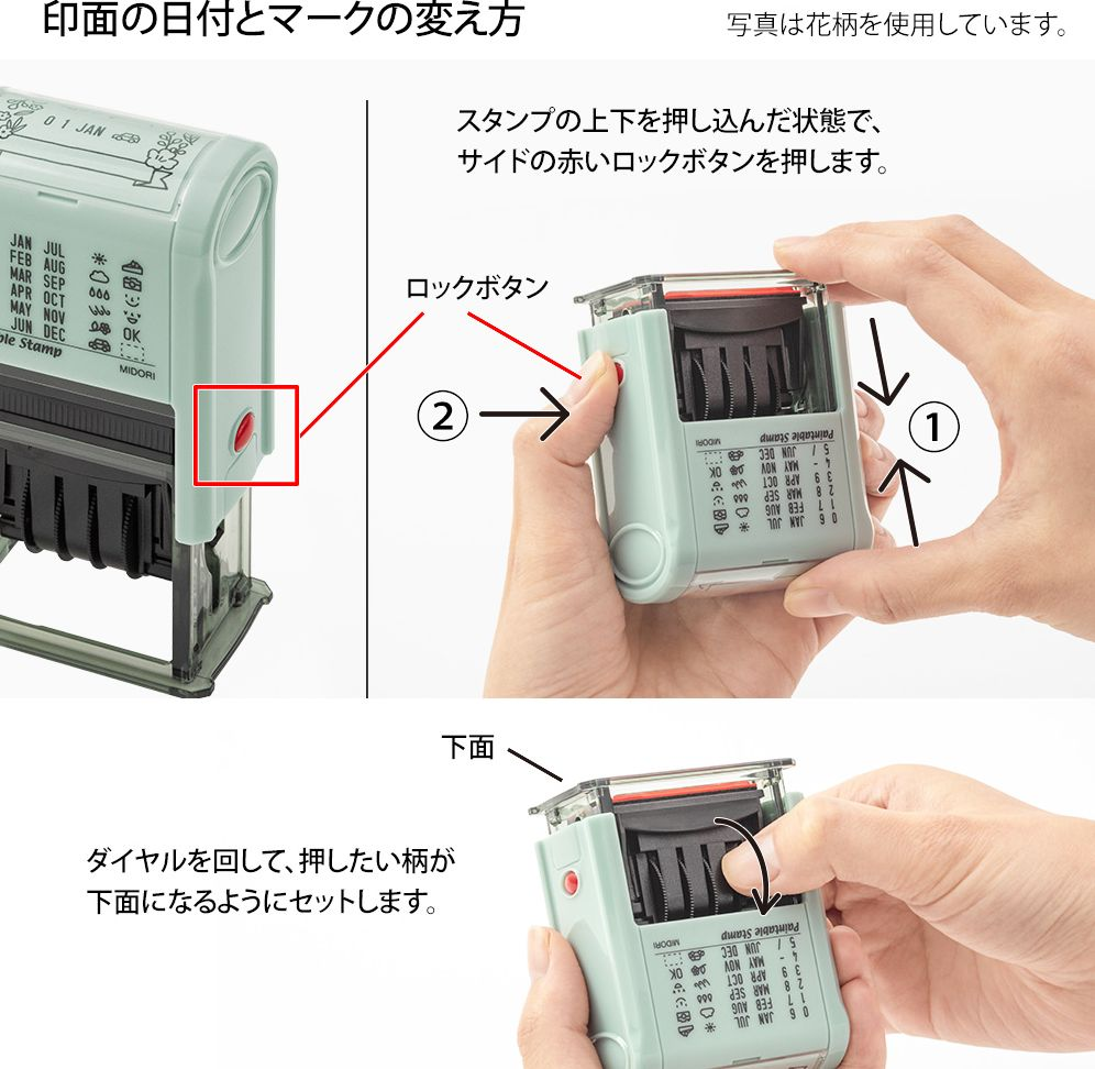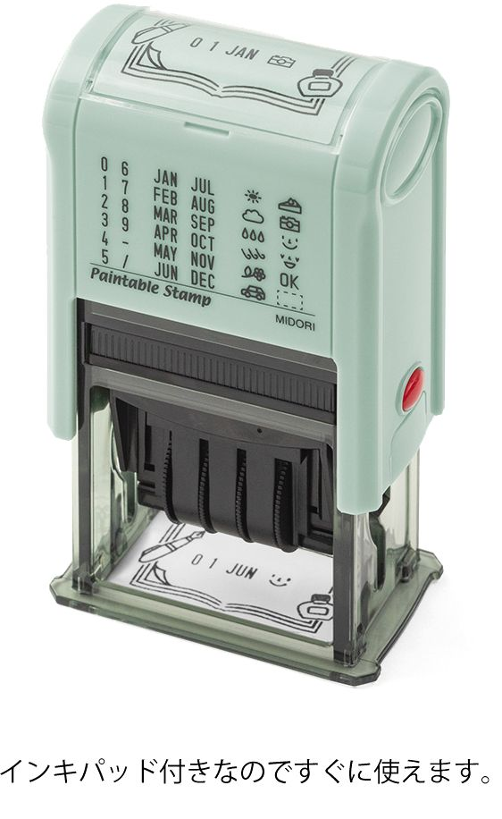 - A rotating date stamp that can be colored and arranged after pressing. Turn the dial to change the date.
