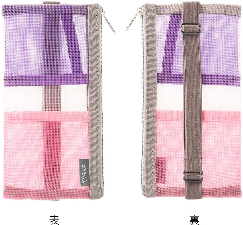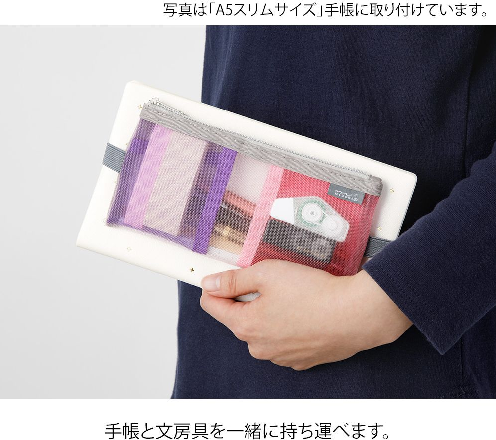 Mesh pen case that can be attached to your planner or notebook. It has an inner pocket and dividers divided by colored nylon mesh. making it convenient for carrying small items. An elastic band at the back allows use with a planner. or notebook from B6 to A5 size.