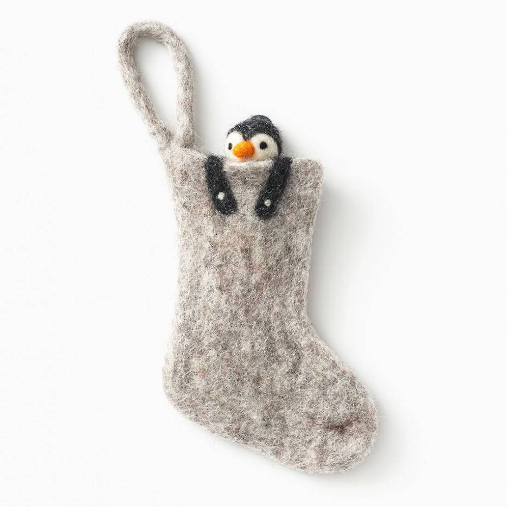 This perfectly fun-sized. handmade. gray stocking is great for stocking stuffers. and the little critter will protect your gifts!