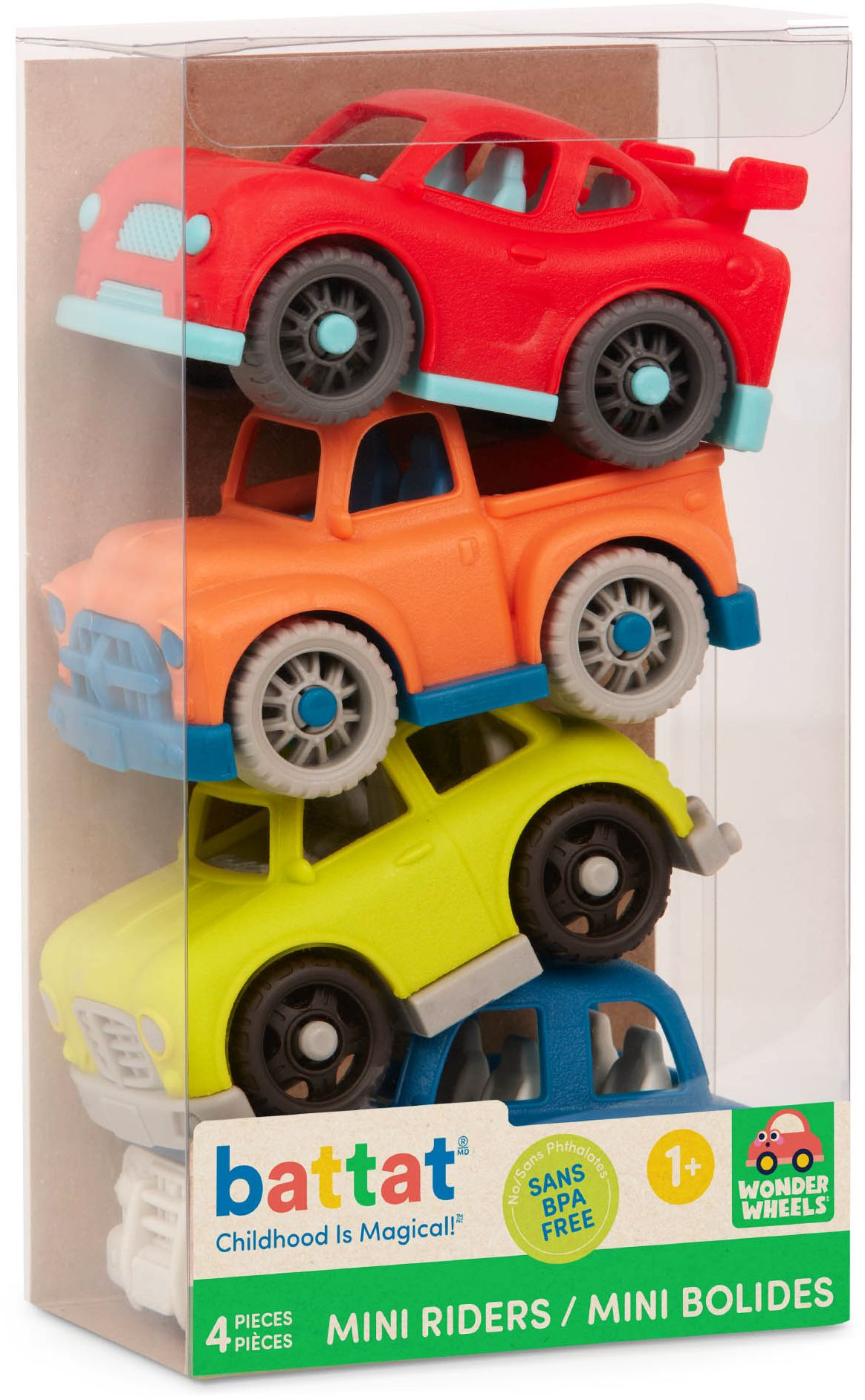 Adventure awaits with Wonder Wheels Mini Riders 1! With 4 colorful toy cars. this set can inspire tons of imaginative pretend play. It comes with a red race car. bright green hatchback. orange pick-up truck. and a blue police car! These tiny hands-friendly toy cars have developmental benefits too your kiddo will be developing their fine motor skills and hand-eye coordination as they drive them around. You can even take the fun outside! Made with durable materials. this set of toy cars is great for outdoor play. These toy cars are made with worry-free and recyclable materials. so your little one can play with peace of mind.