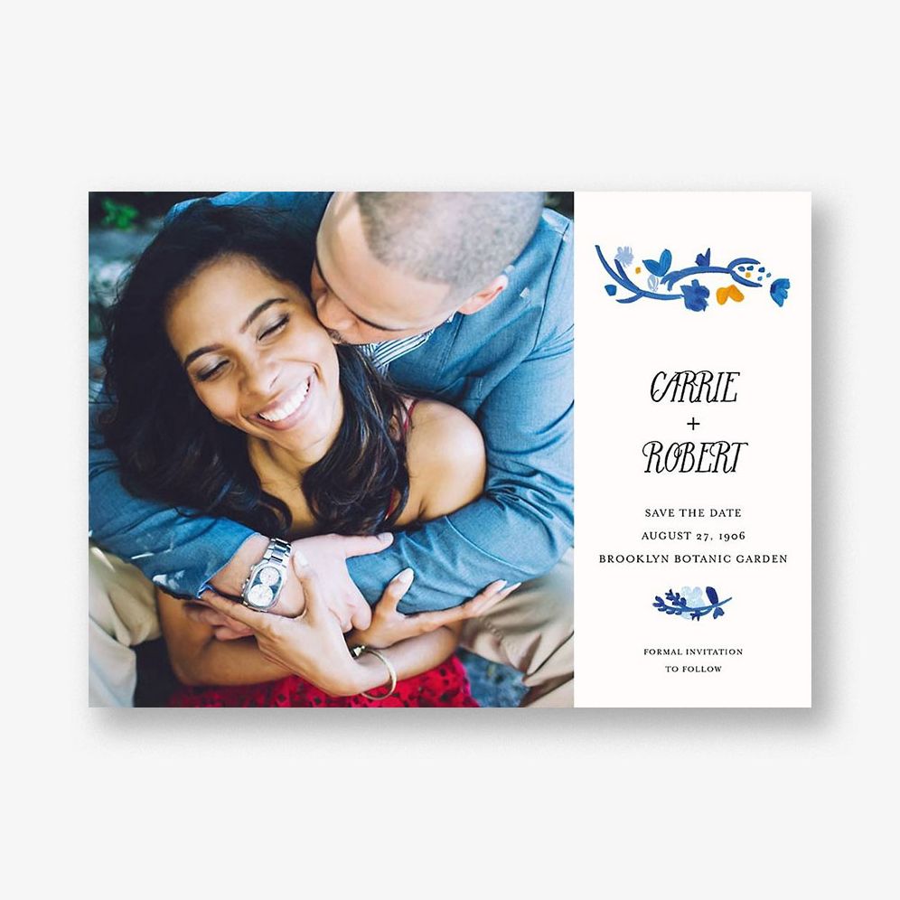 Send a Save the Date card that’s unique and personal by adding a favorite photo. Like the matching wedding invitation. this hand-painted design features a floral motif in shades of blue and yellow.