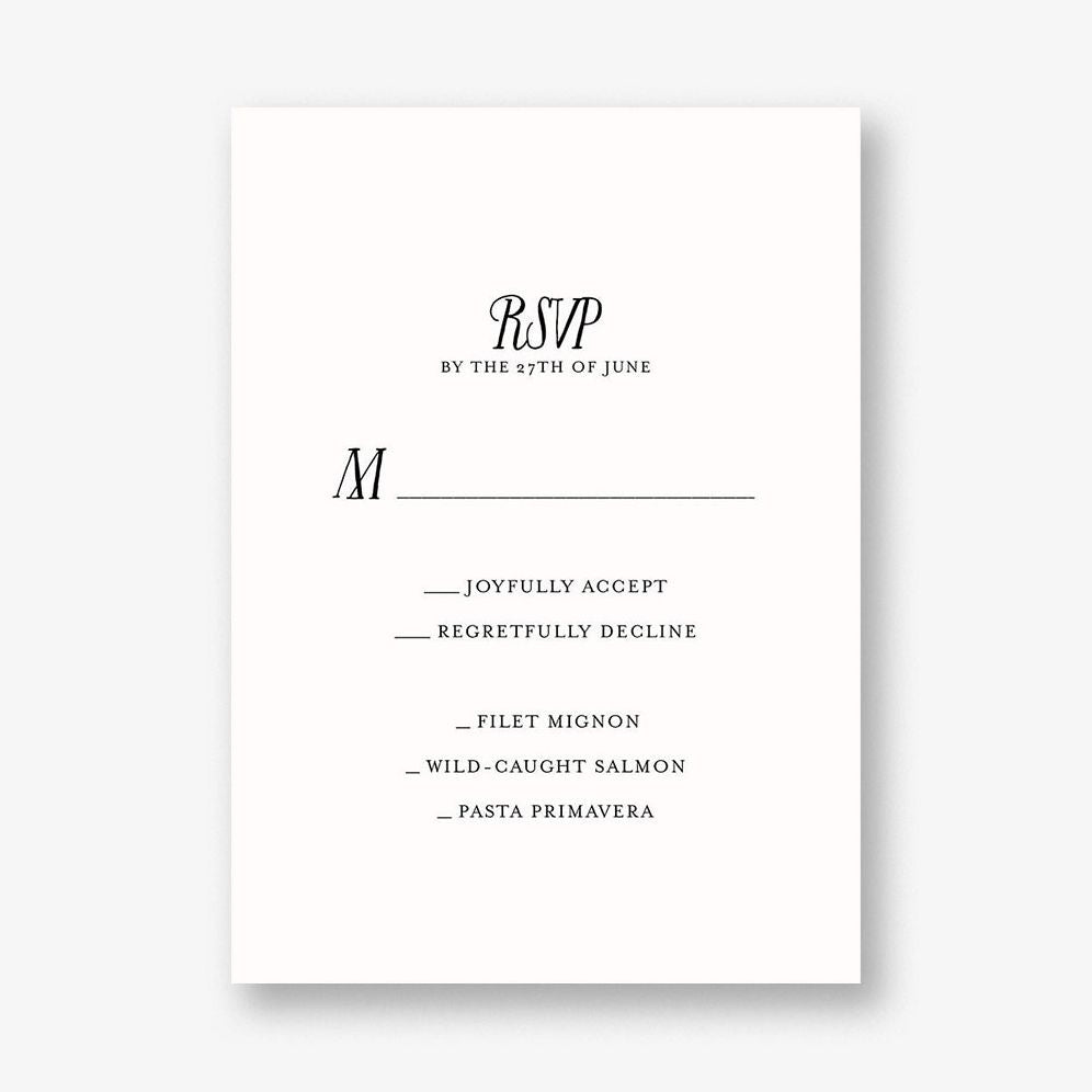 Complete your wedding invitation suite with a coordinating response card – the traditional way for guests to let you know if they will be attending your event. Design keeps it simple with bold font and your customized response options.