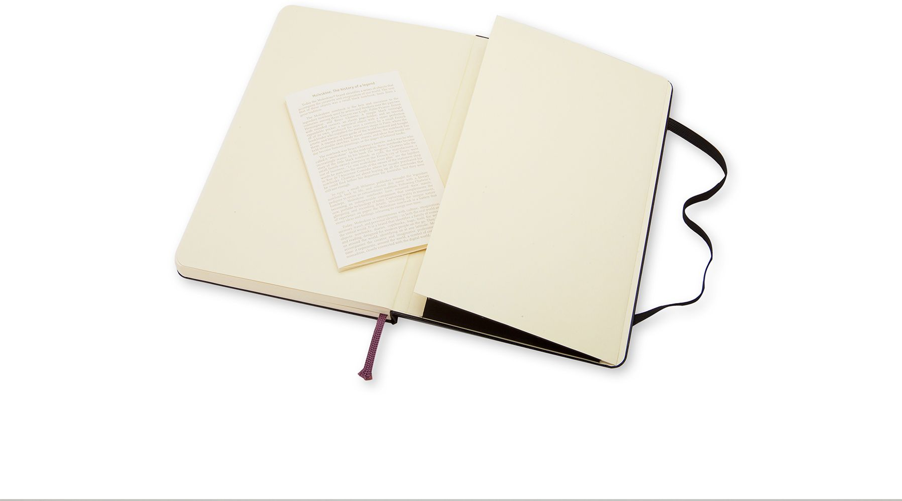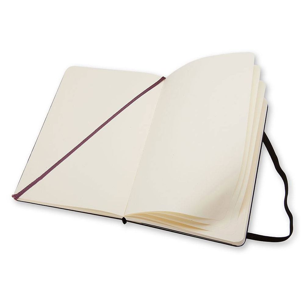 This basic. yet classic Large Plain notebook is one of the best-selling Moleskine notebooks. This reliable travel companion. perfect for sketches. thoughts and passing notes. has a cardboard bound cover with rounded corners. acid free paper. a bookmark. an elastic closure and an expandable inner pocket that contains the Moleskine history.