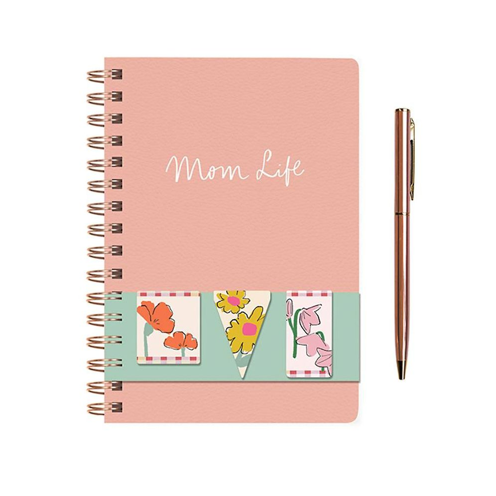 This spiral journal is 6.25 X 8.25 and features a vegan leather wrapped hardcover. The journal includes a pen and a magnetic bookmark set that is perfect for keeping organized. Containing 160 pages. this journal is great for grocery lists. goals. inspirations. and journaling.