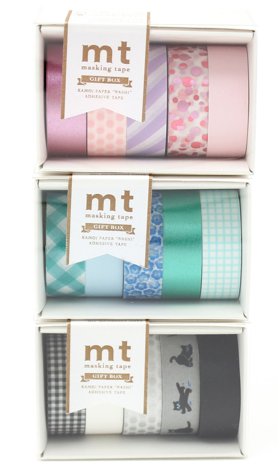 MT Masking Tape set. Includes 5 Kamoi paper washi adhesive tape in complimentary shades of blue and blue themed patterns