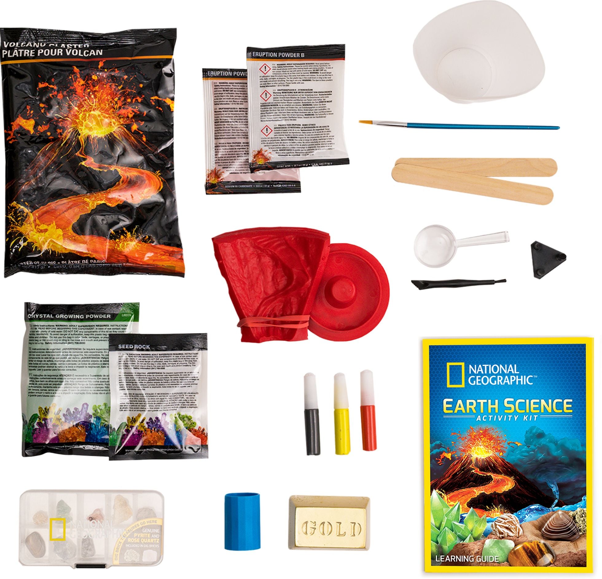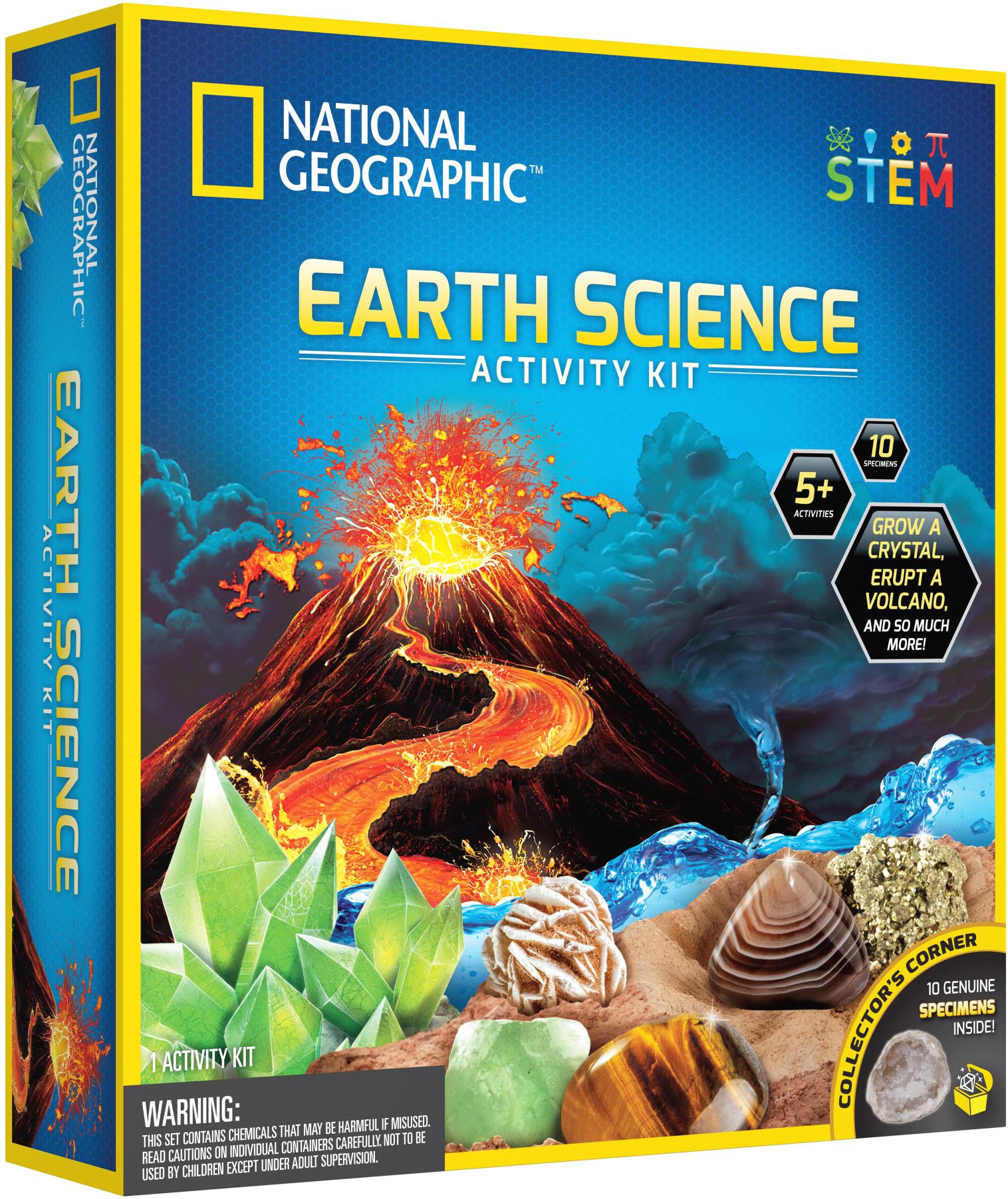 The National Geographic Explorer Science Series Earth Science Kit is a must-have for any promising young scientist!Kids will love making their very own erupting volcano. experiencing the magic of chemistry as the eruption powder reacts with water. Looking for another eruption formula? There are multiple variations to try in the clear. easy-to-follow instructions.They will also be amazed as a potion of water and crystal-growing solution grows into a fully formed crystal! Our special crystal-growing formula means crystals can fully grow in as little as 3 days!No Earth science kit would be complete without activities centered on geology. which is why there is a pyrite dig brick in the kit. Additional rock and mineral specimens in the kit are the perfect start to a rock collection. and include snowflake obsidian. tiger’s eye. green fluorite. pumice. desert rose. blue calcite. and a geode. For Ages: 8+WARNING: Choking Hazard; Small Parts. Not for children under 3 years old.