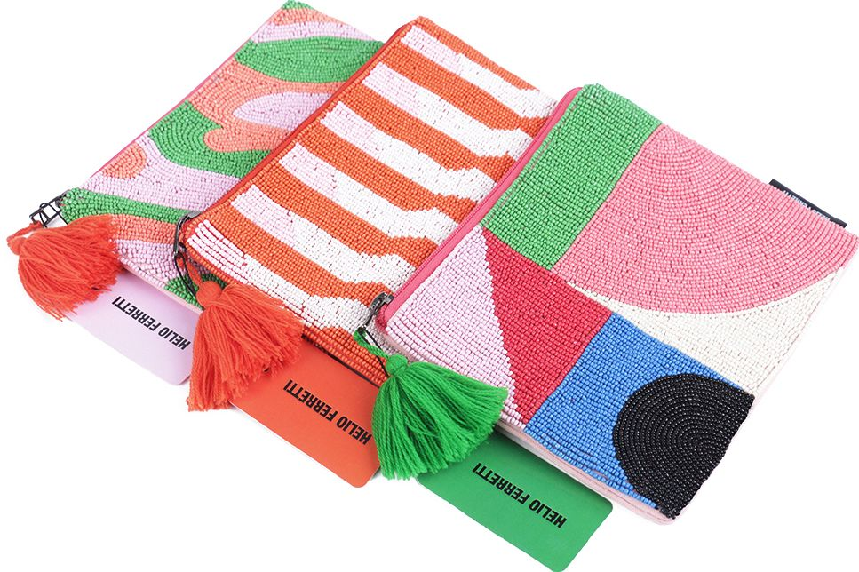 Large clutch with an original design. Crafted with small stitched beads forming a pattern of lines in white and orange. It features a zipper as the closing mechanism. including a tassel to facilitate opening.
