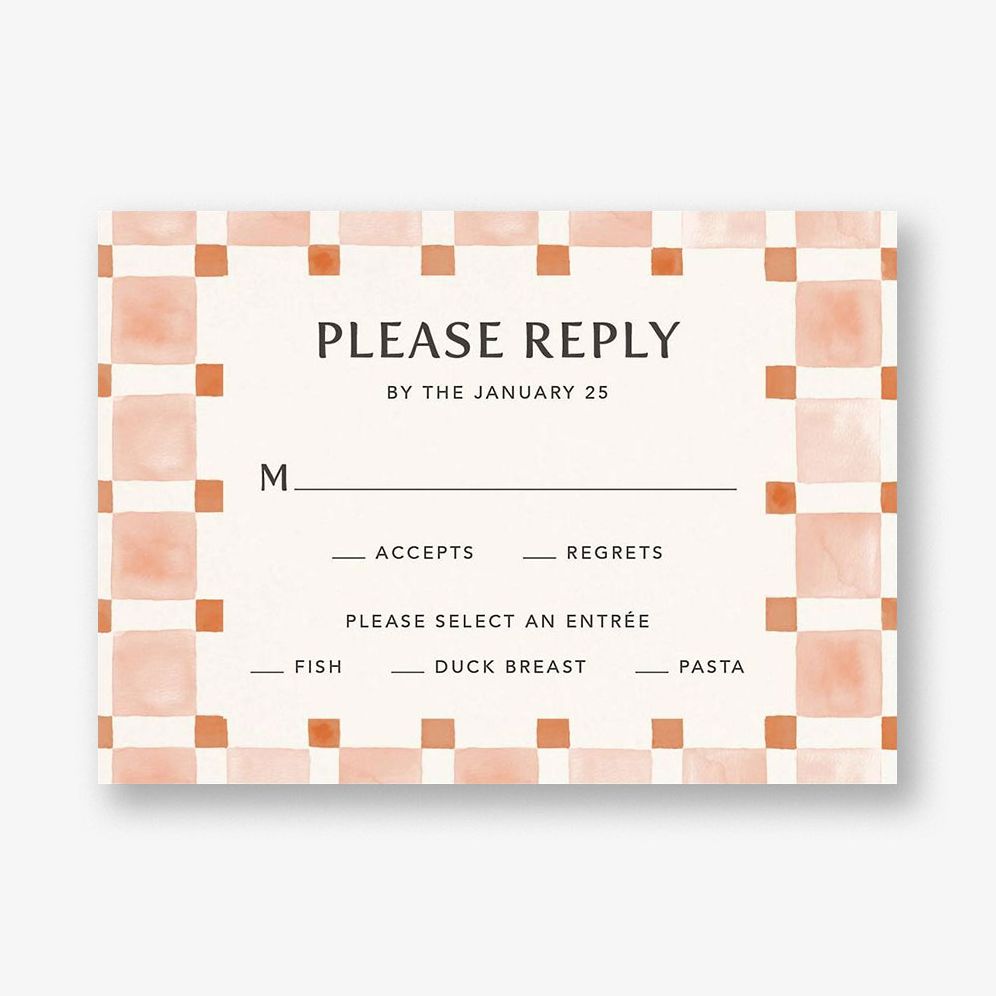 Pair these response cards with your “Organic Check†invitation suite from Paperless Post. or mix and match to your style from any suite in our wedding collection. Printed on Mohawk superfine white 130 lb. card stock that is soft to the touch and matches our superfine white envelopes. This paper is FSC certified. with 30% post-consumer recycled content. and made using wind power. Running low on time? You can with our partners at Paperless Post.