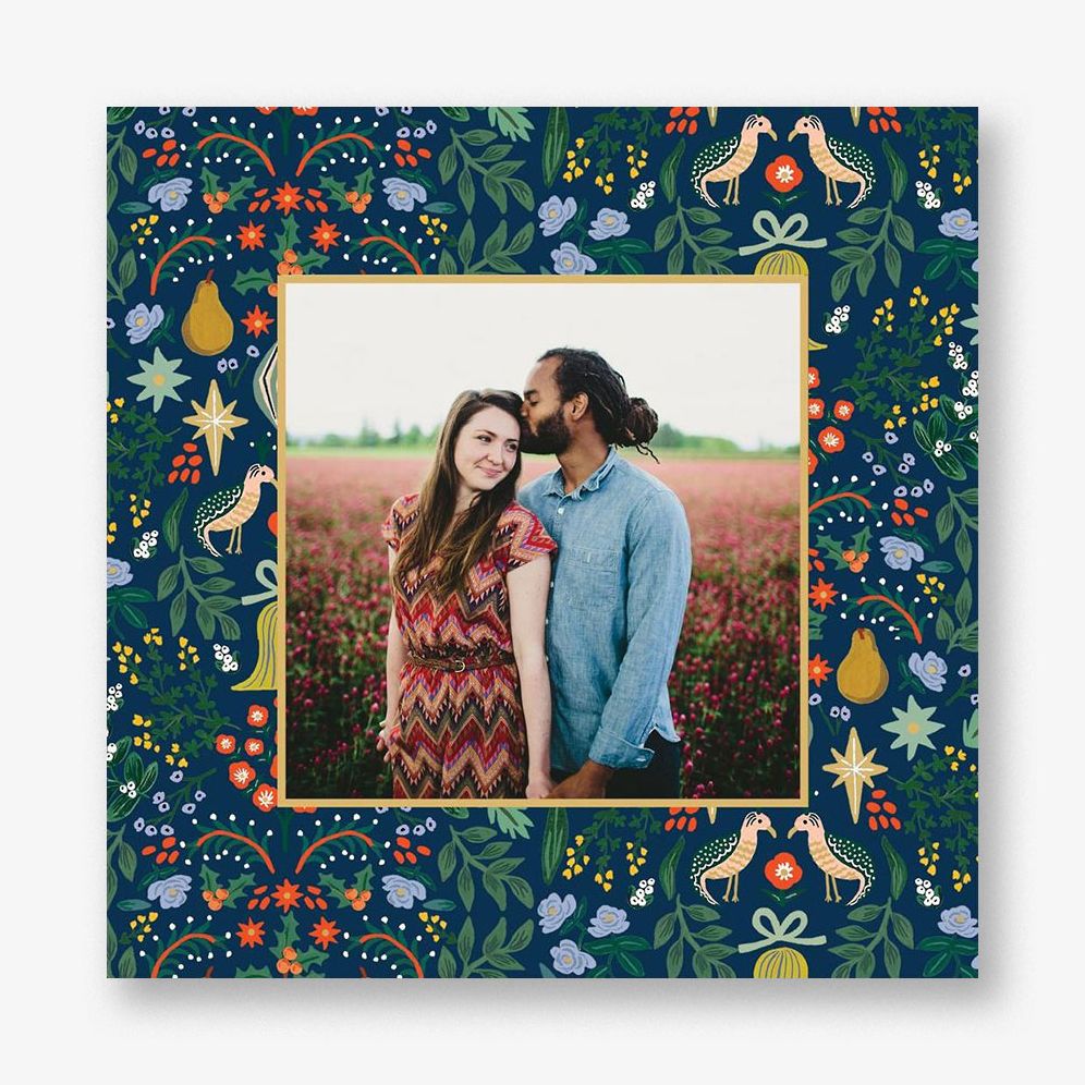 An elegant pattern of florals and greenery complements the partridge from the 12 Days of Christmas on this sophisticated holiday card. designed by Rifle Paper Co. for Paperless Post.