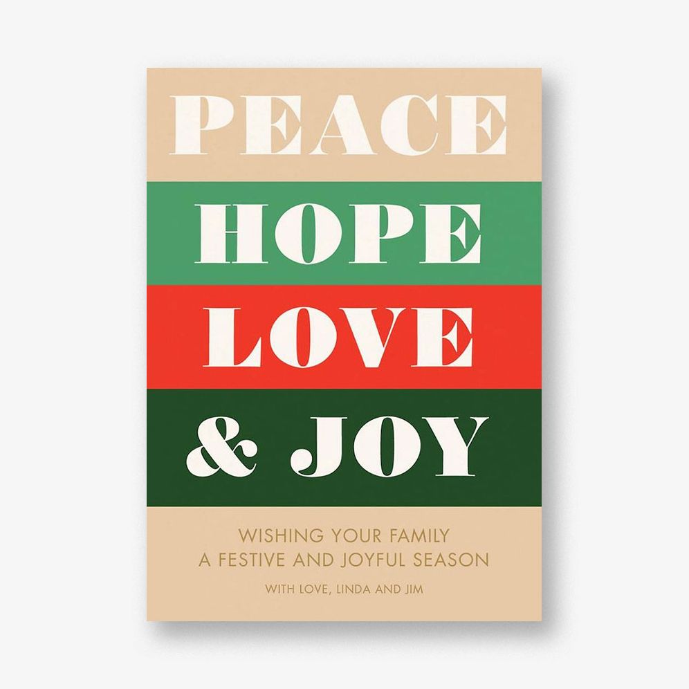 Let those you love know that you’re thinking of them with this personalized holiday card from Rifle Paper Co. by Paperless Post. This card reads Peace Hope Love & Joy and can be further customized with a message from you and your family. Printed on Mohawk ultra white 120 lb. card stock that is soft to the touch and matches our superfine white envelopes. Paper is FSC certified and made using wind power.