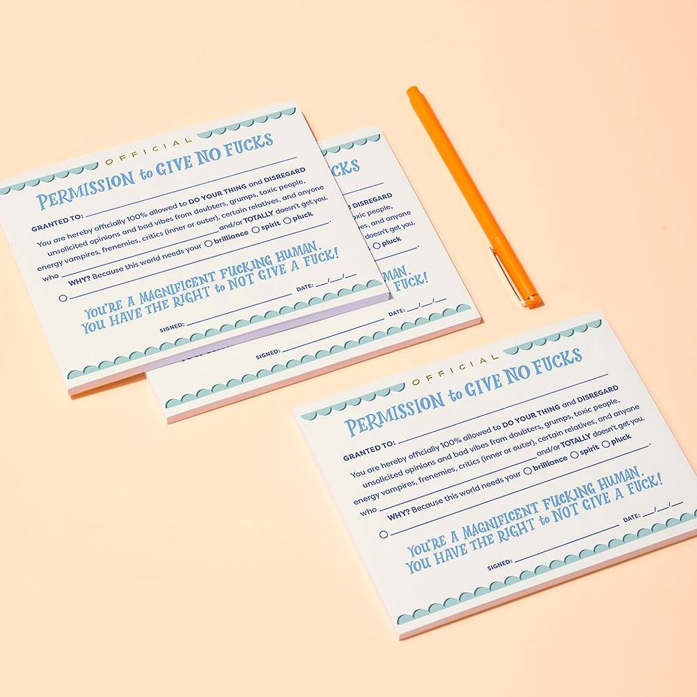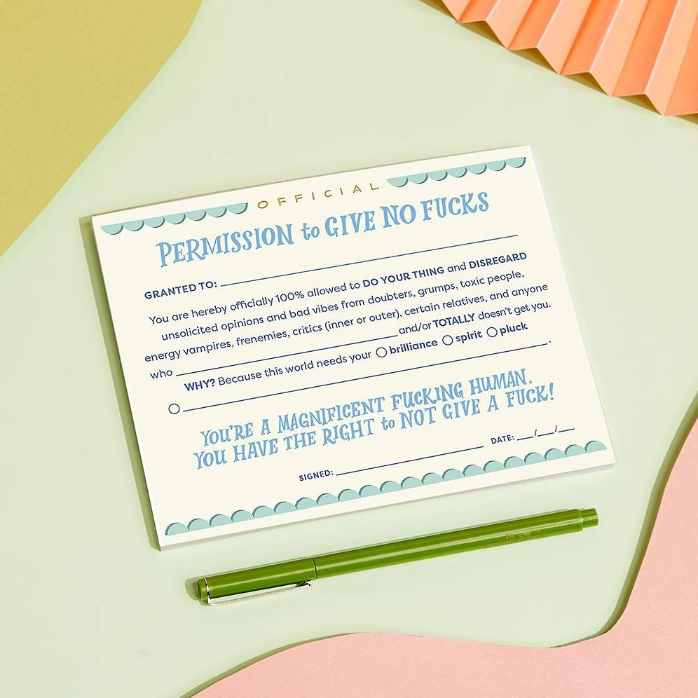 Everyone craves permission for certain things. at certain times (right?!). This pad of 50 slips encourages people to follow their guts and honor their truths??in a super fun. semi-official-ish way. They’re great for sticking on fridges. mirrors. bulletin boards ??? wherever lols and actual inspiration are needed! Share ’em freely with other magnificent humans??and with yourself. This is your official permission.????