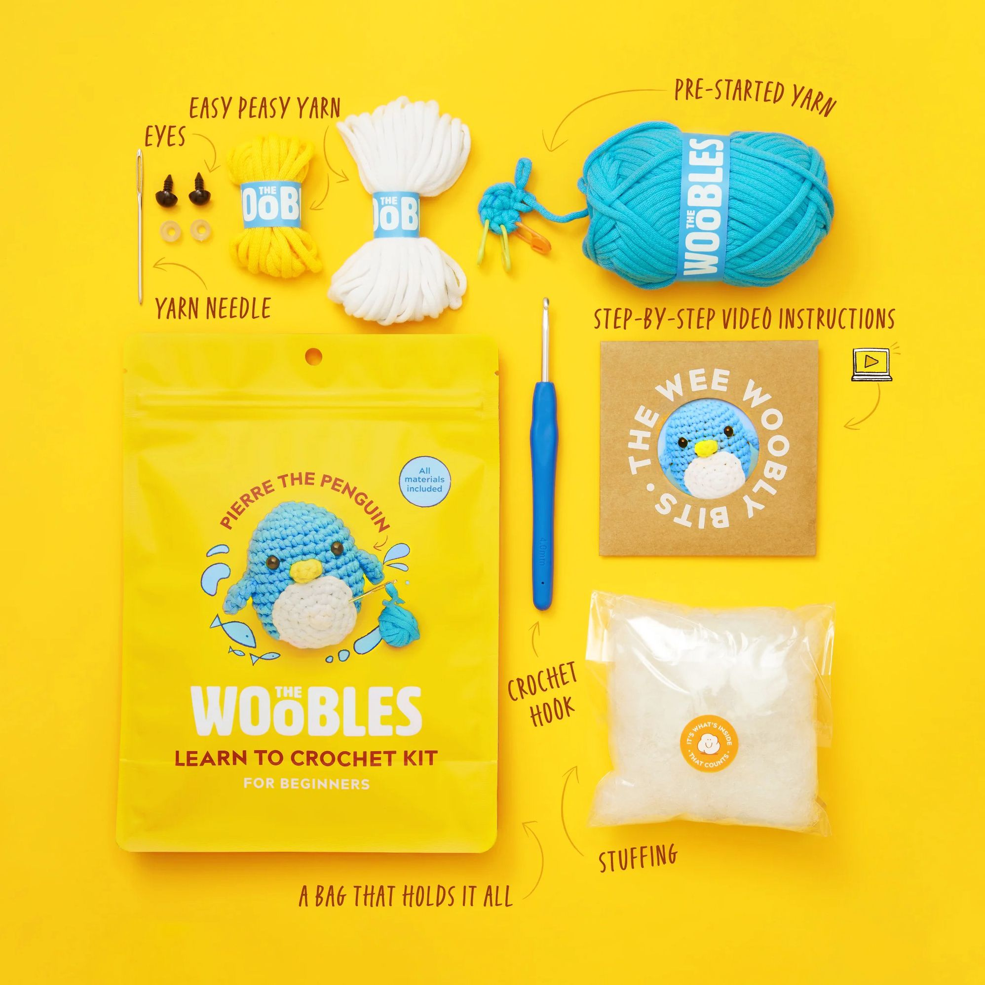 Introducing Pierre the Penguin The Woobles Penguin Crochet Kit. The Woobles Penguin Crochet Kit is perfect for beginners! The kit includes all the materials you need. plus step-by-step video tutorials that expertly guide you through each stitch and technique that matches the kit in your hands. These tutorials are designed to take the stress out of starting your project and make it easy for new crafters to dive straight into the fun. With this kit. you’ll be able to create an adorable penguin that you can keep for yourself or give as a heartfelt gift. The skills you learn from this kit will enable you to crochet a wide range of other projects. including other Woobles! In addition to the video tutorials. the kit includes everything you need to get started on your crochet journey: Pre-started penguin character. Custom-made. Easy Peasy yarn that cannot fray. 4mm crochet hook. Stuffing. Plastic eyes. Tapestry needle. Stitch markers Right- handed and left-handed tutorials available Size About 4.5 in (11.4 cm) tall. As a handmade item. exact size depends on the crocheter. Skill level Beginner. recommended for ages 12+
